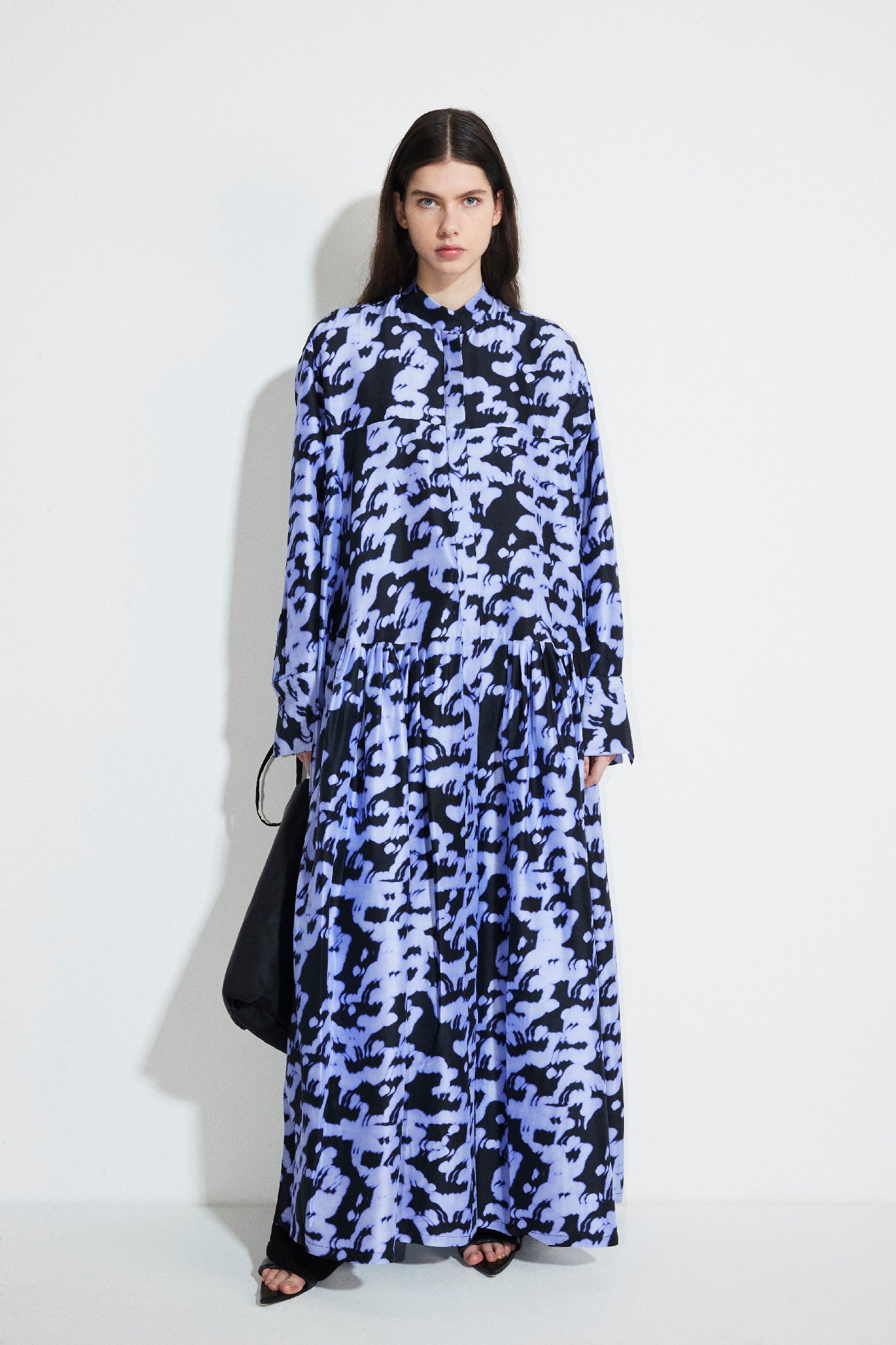 Loose fit long dress with batherings, button down closure, stand-up collar, long sleeves in printed dupioni silk.