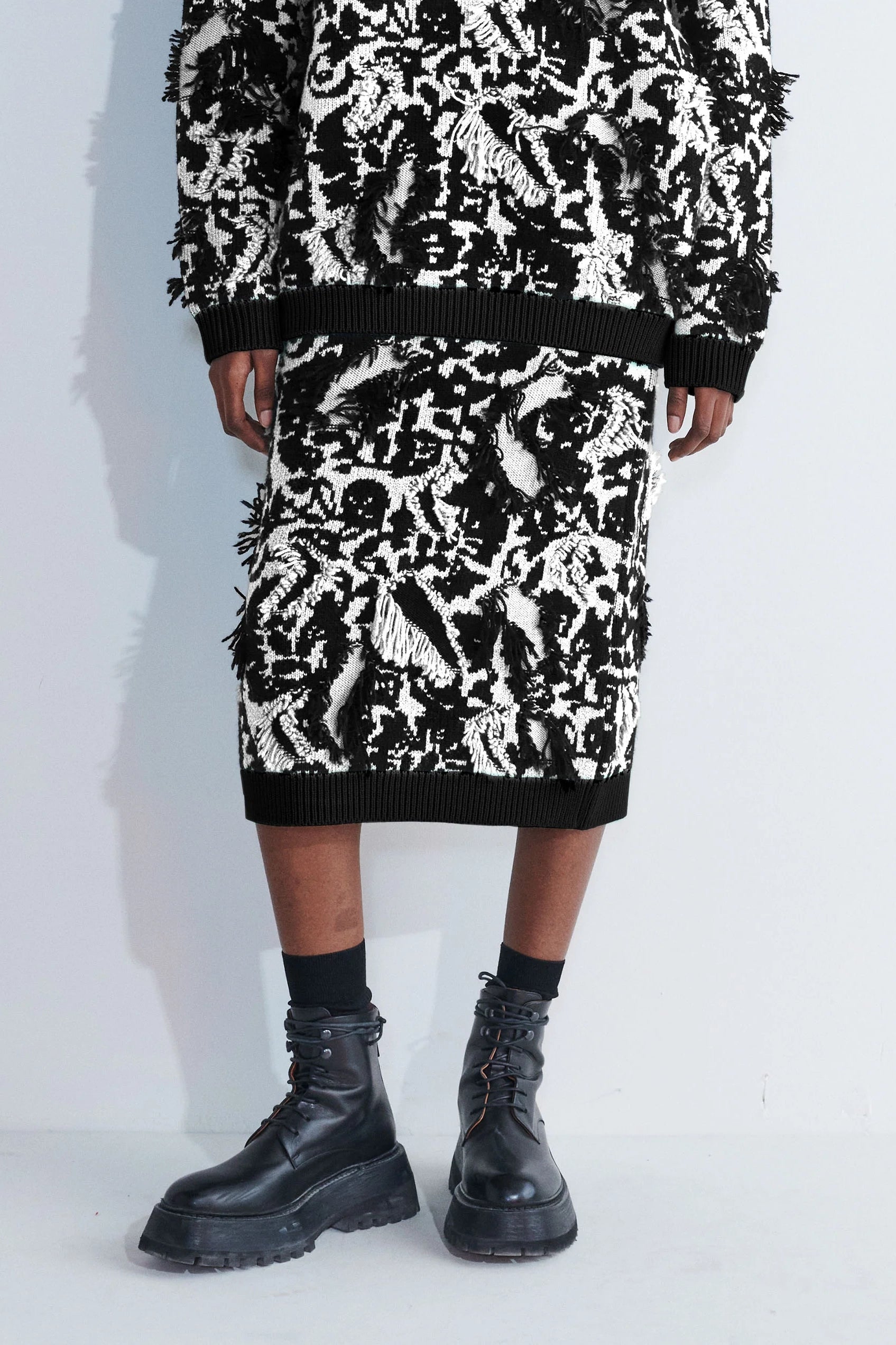 Mid-length wool jacquard pencil skirt with all-over fils coupes detailas.