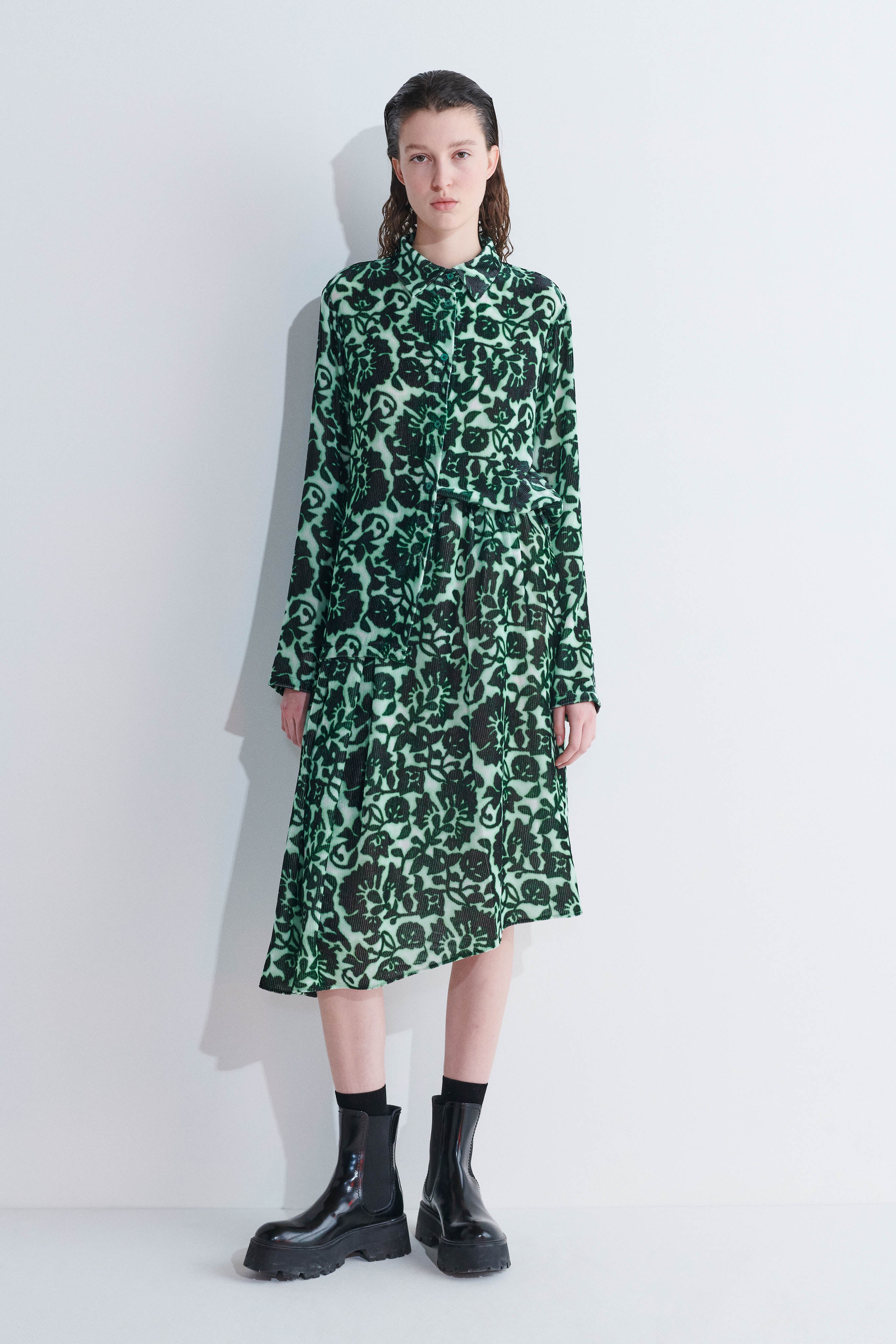 Mid-length asymmetrical elastic waistband skirt in printed corduroy.