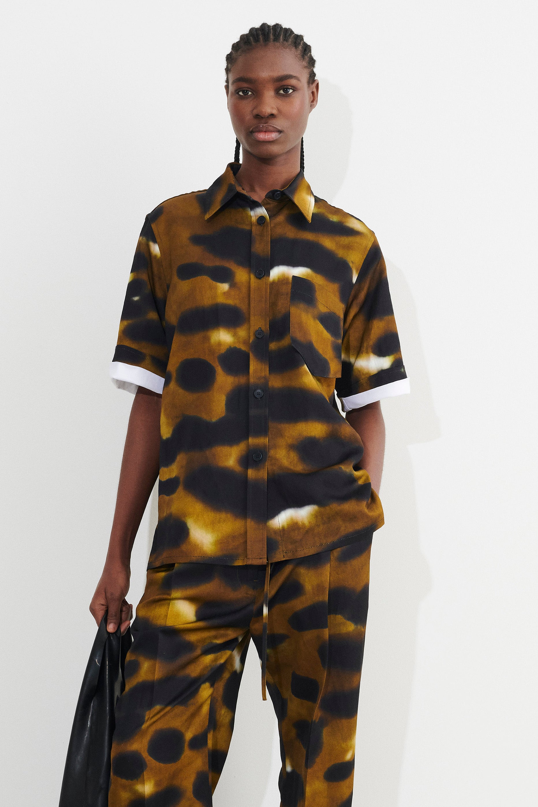 Short sleeve shirt with turn up sleeves, button down closure and classic collar in printed viscose linen.