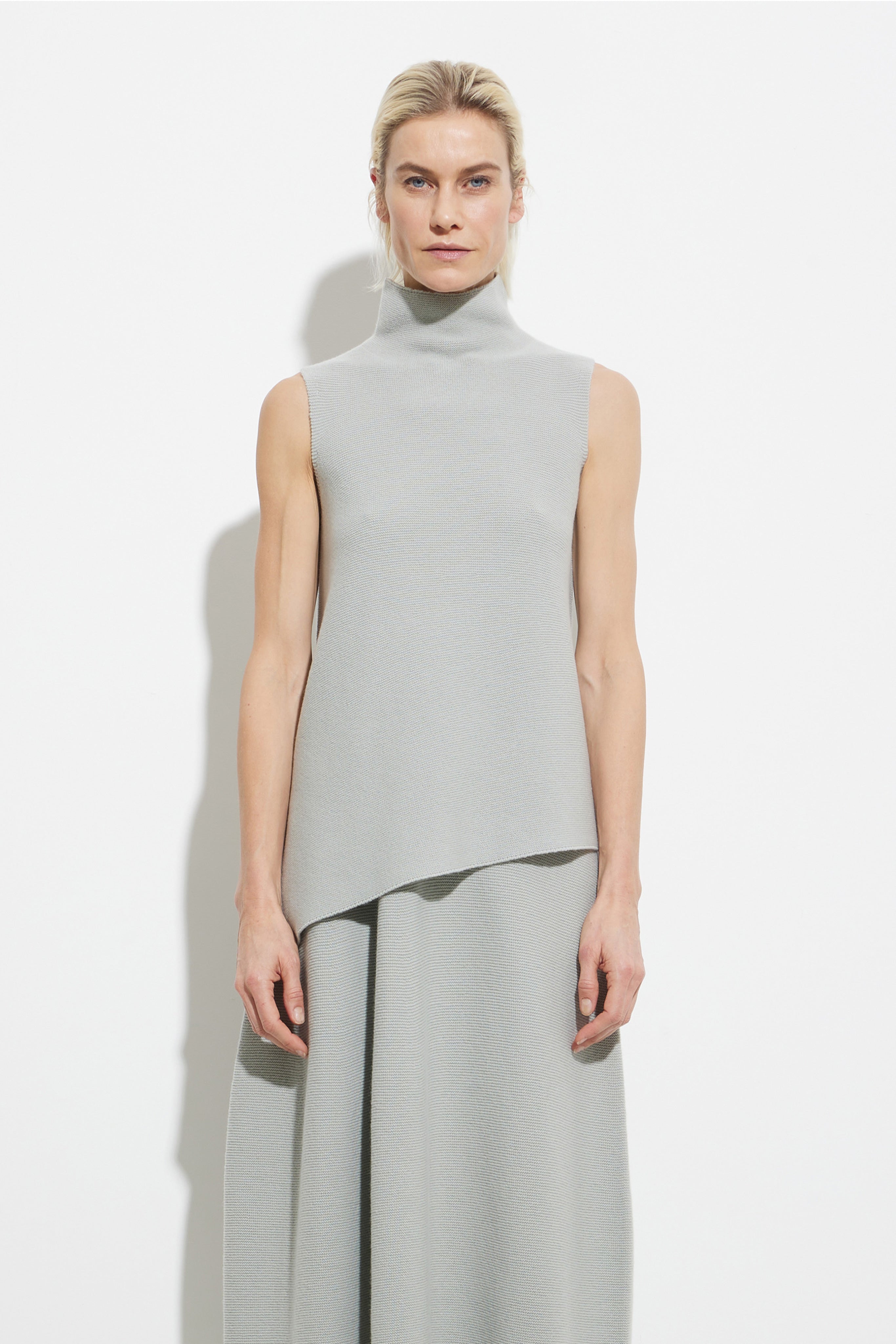 Sleeveless top knitted seamlessly from extrafine merino wool. Features a sculptural high neck and an asymmetrical hemline that drapes softly over the waist. The clean finish and subtle volume evoke a modern sense of ease.
