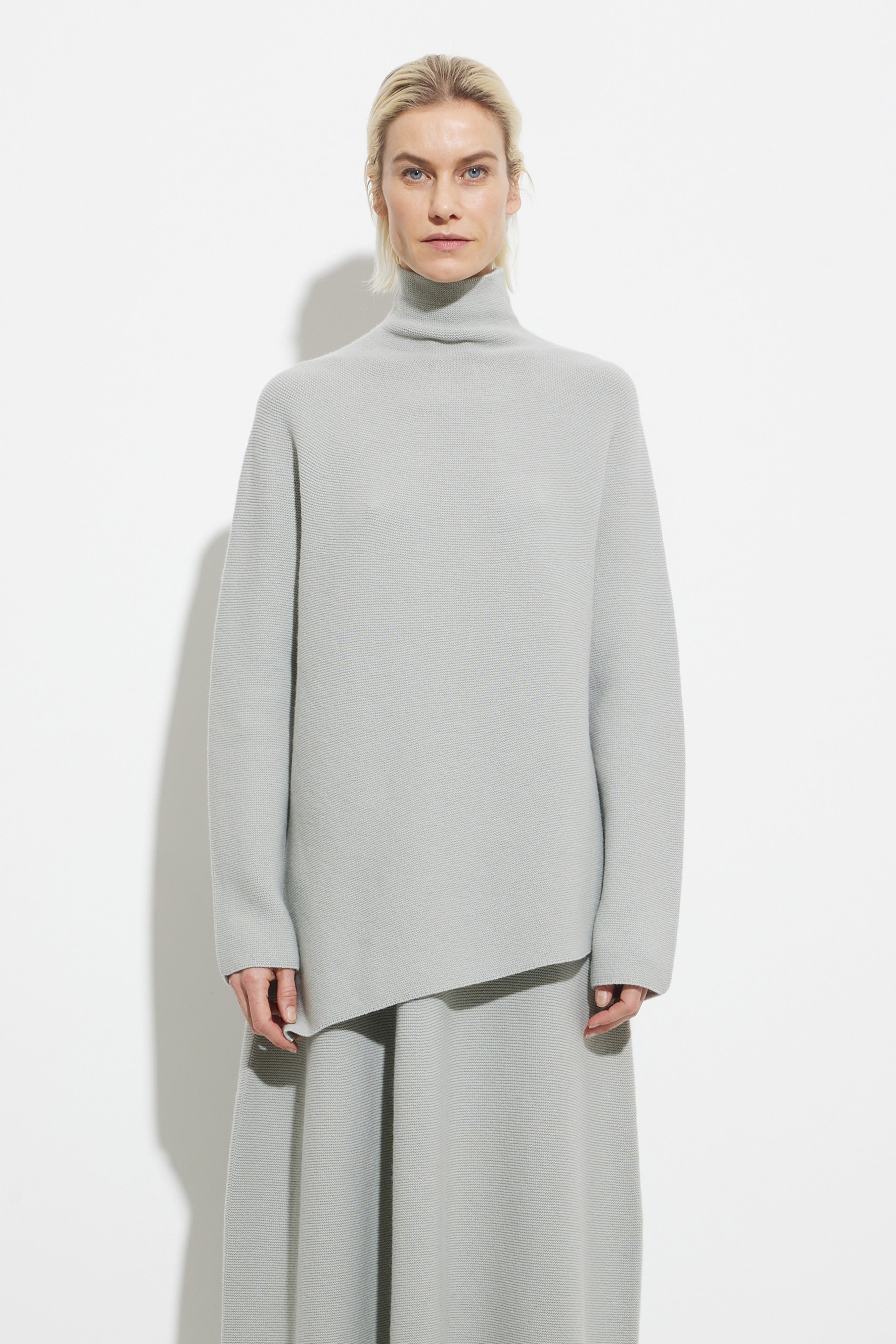 A-line sweater in extra fine merino wool, featuring a high neckline and elongated sleeves. The body is cut without seams for a refined drape and fluid movement. Finished with an asymmetric hemline that adds quiet tension to the silhouette.