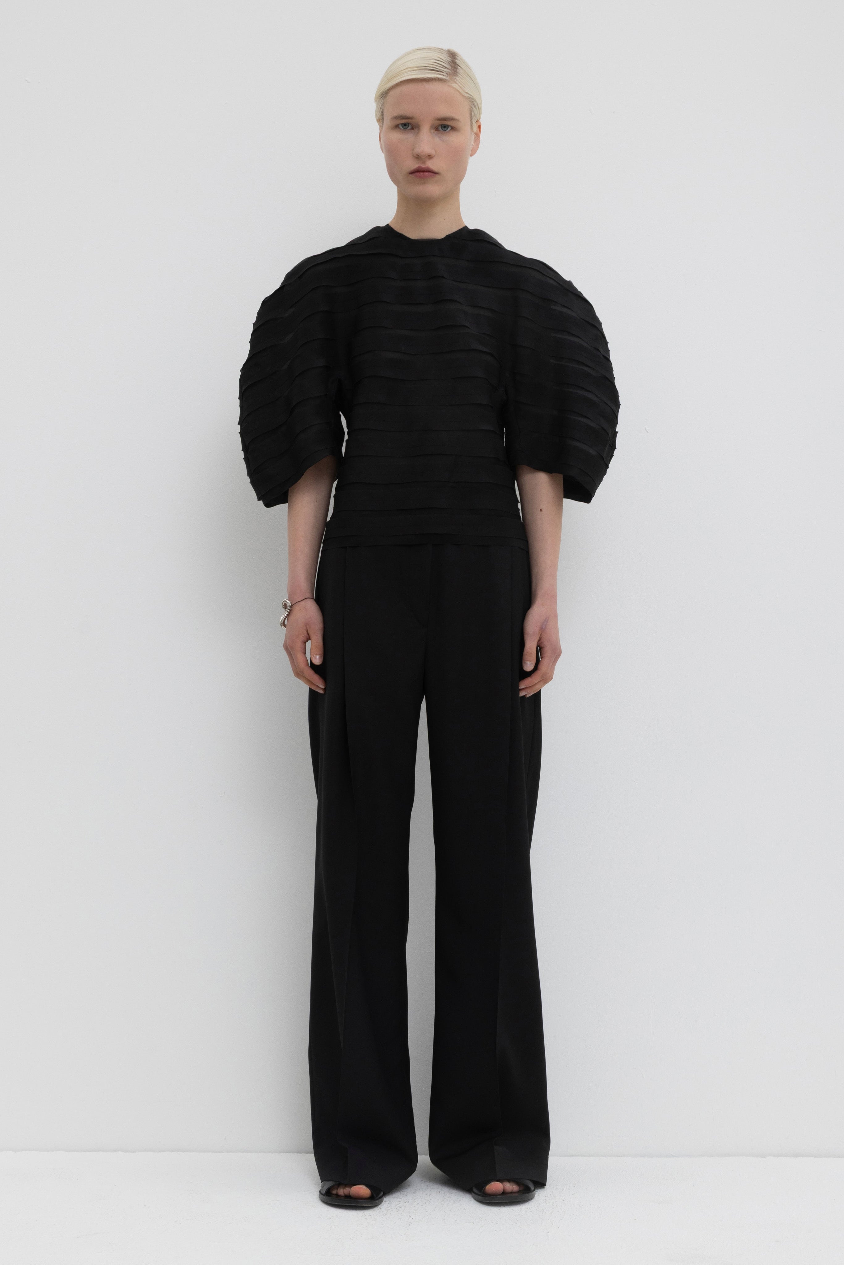 Tesina Woven Top in silk with a striking geometric shape made by hand. The handmade cutting process gives each piece its own distinct look, with clean lines that fall naturally. A refined choice for understated elegance.