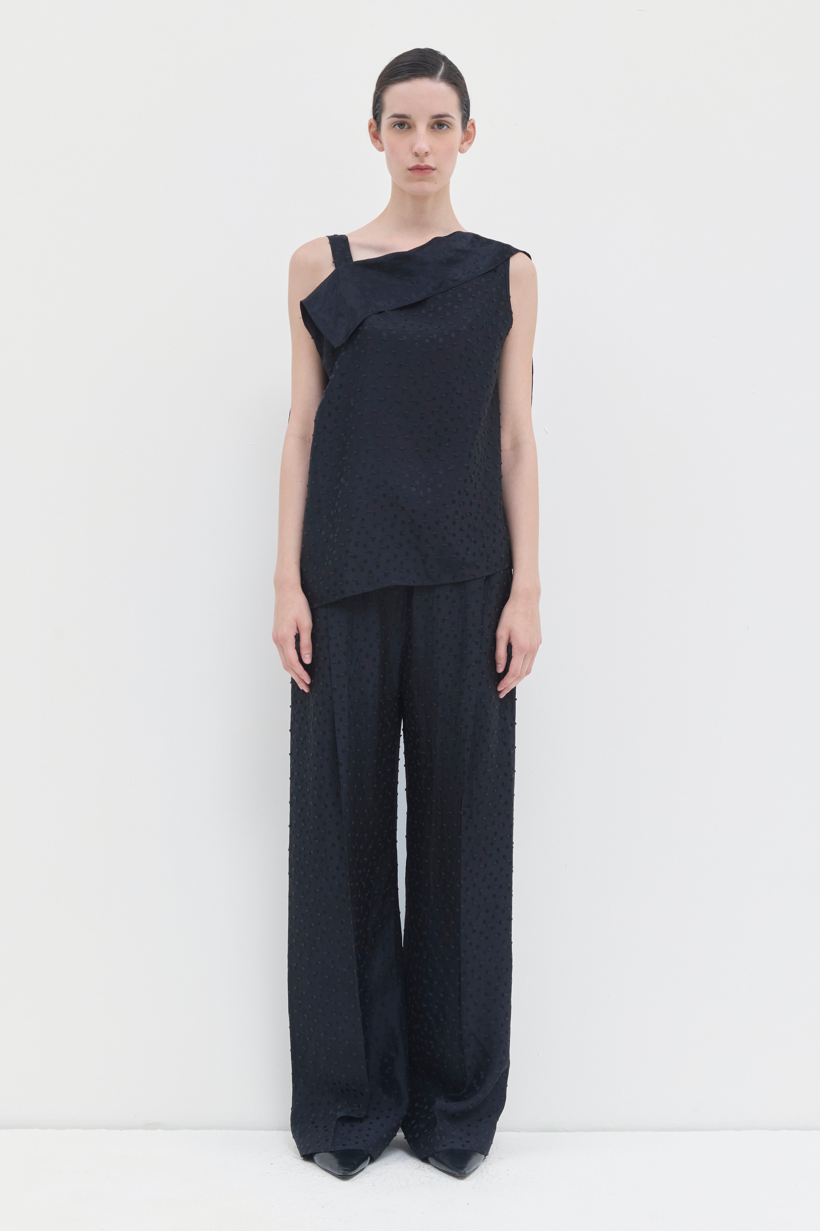Turini Woven Top in black petrol acetate with an asymmetric cut, practical flap detail, and shoulder strap. The soft, flowing fabric moves with ease while the distinctive shape adds character. A polished dotted piece that works beautifully layered or worn alone.