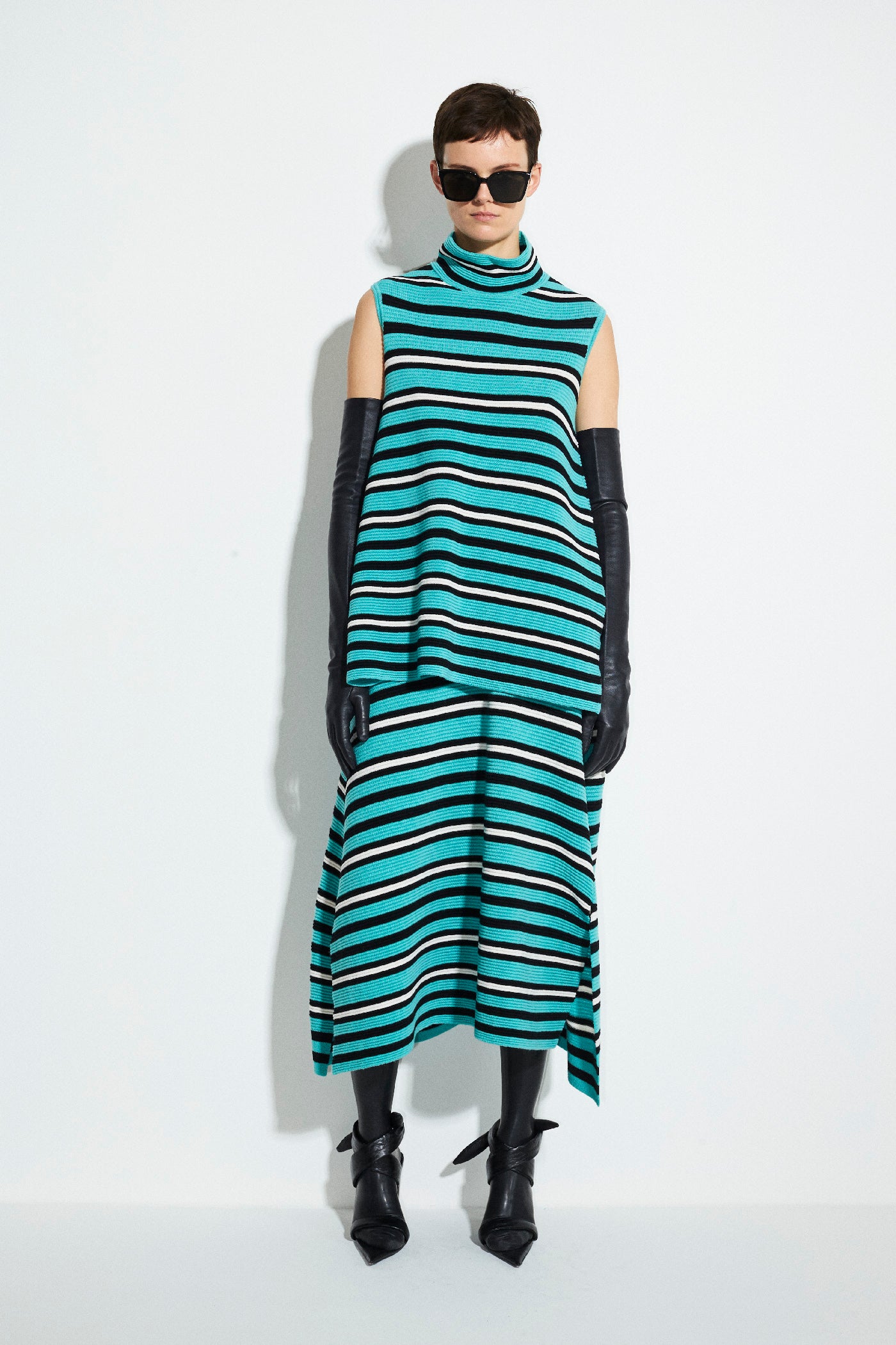 A-line knitted sleeveless top with turtle neck in striped ottoman stitch virgin wool.