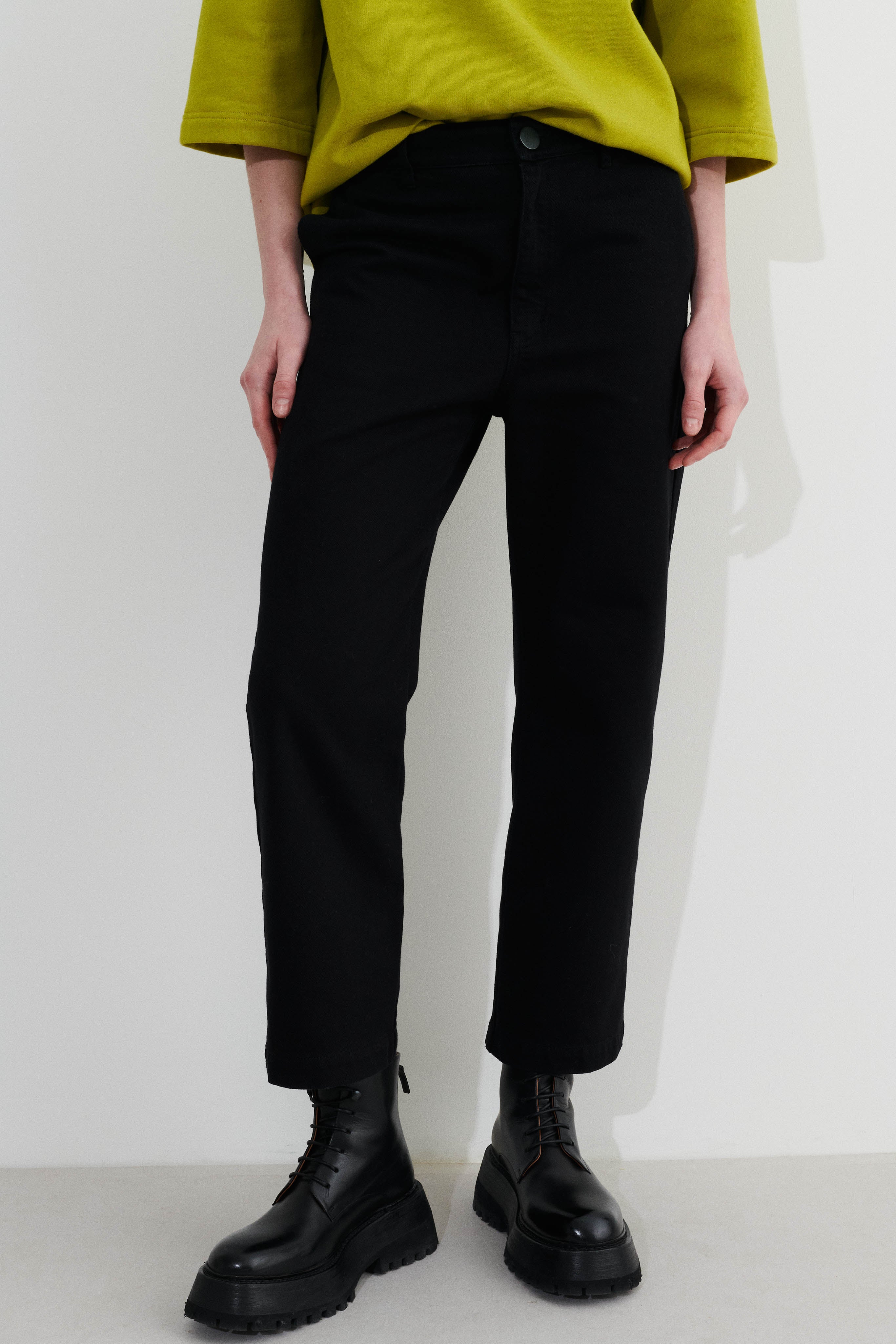 テーパードクロップトパンツ、斜めサイドポケット、バックにフラップポケット付き、デニム素材。