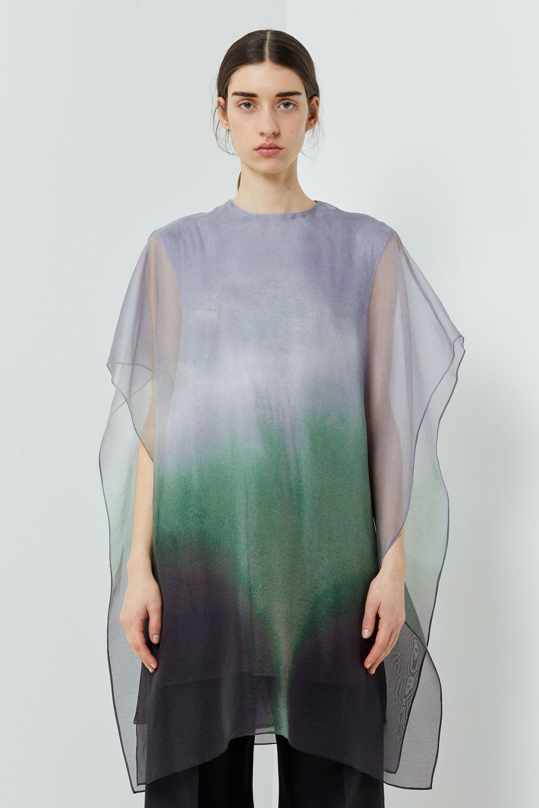 - Two layers: Organza top layer on a silk satin top.