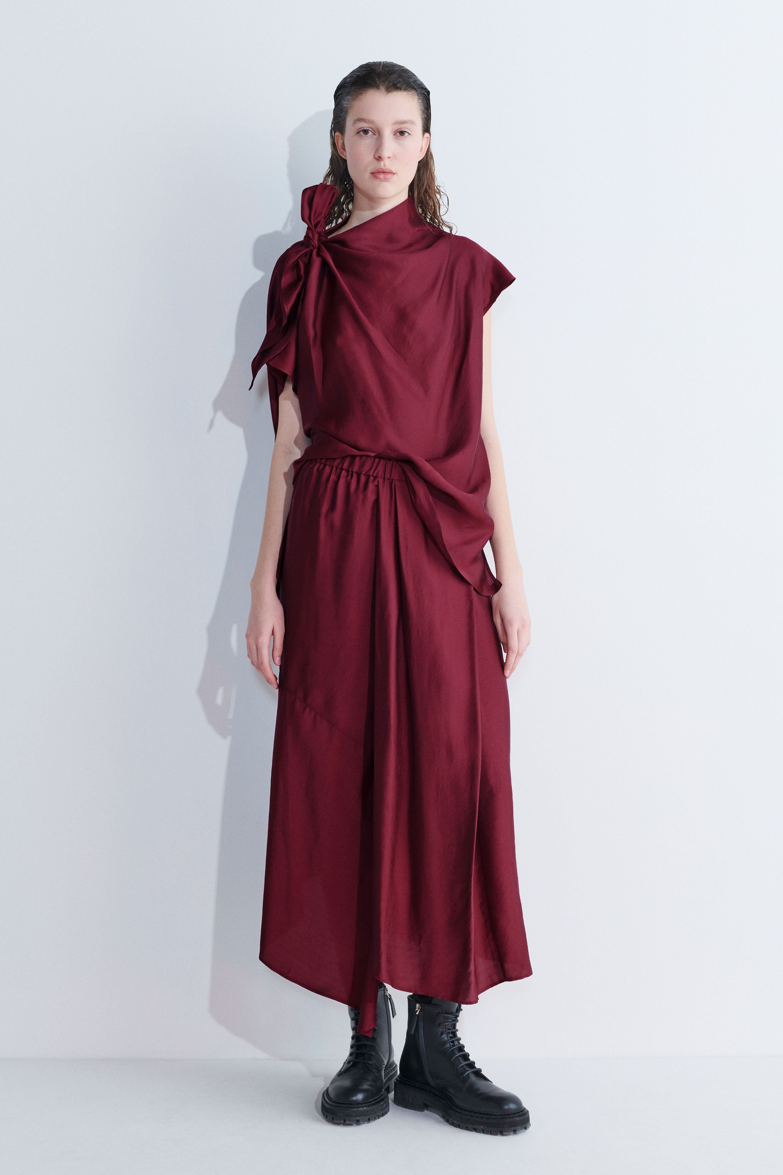 リボンディテール付きキャップスリーブドレープトップス、ドレープビスコースシルク素材。