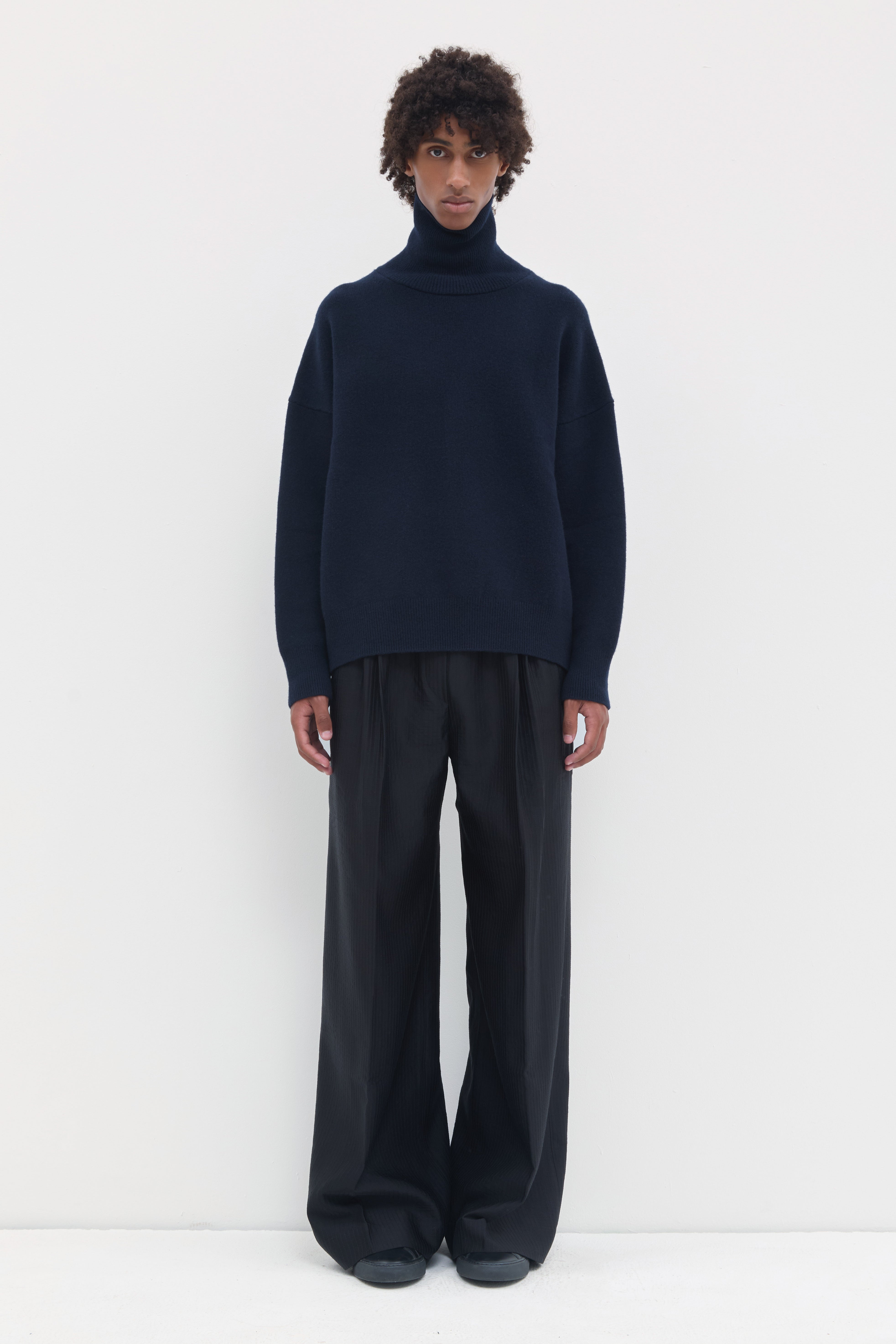 深みのあるネイビーの、リラックス感のあるタートルネックセーター。極細メリノウールで編み上げました。ややオーバーサイズのシルエットで、ドロップショルダーとロールネックラインが首元から少し離れて立体的な印象を与えます。裾はワイドリブで仕上げ、繊細な立体感を演出しています。