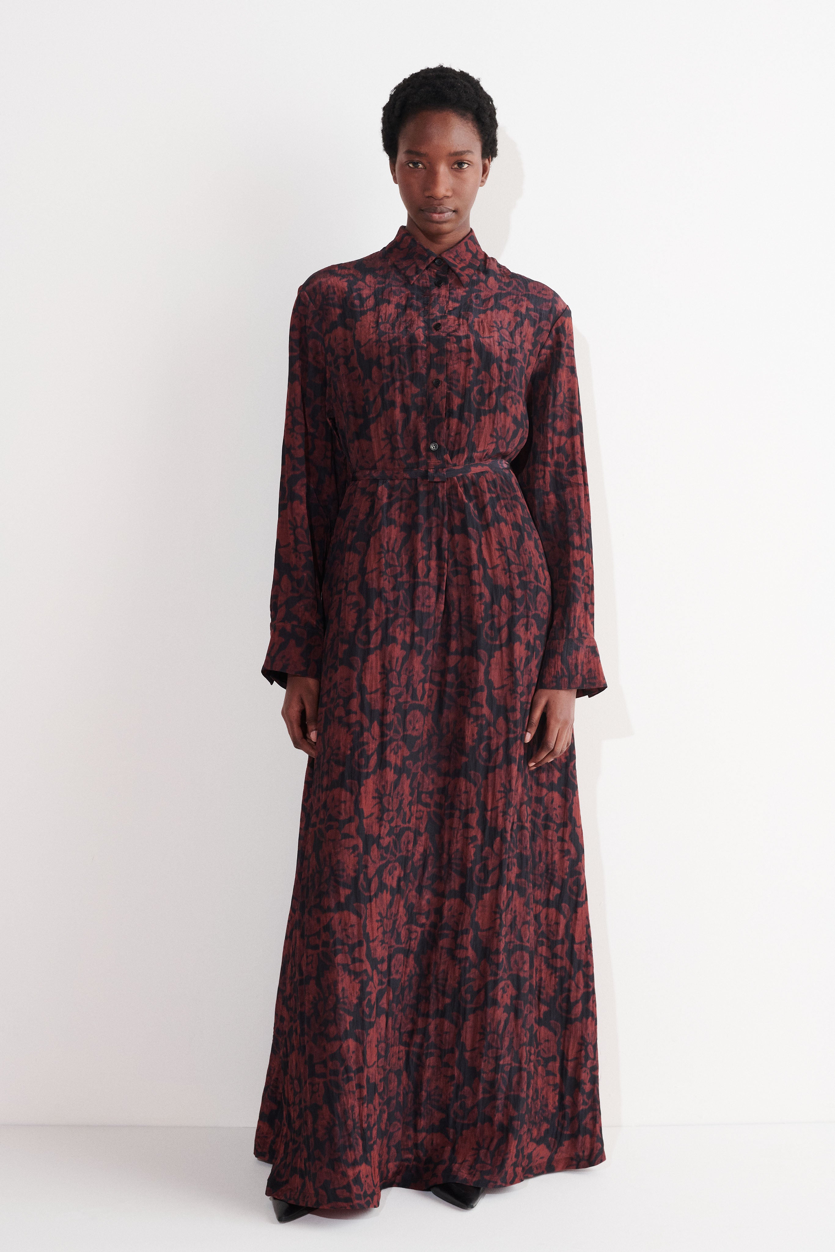 Floor length long sleeve a-line shirt dress, in printed light nylon