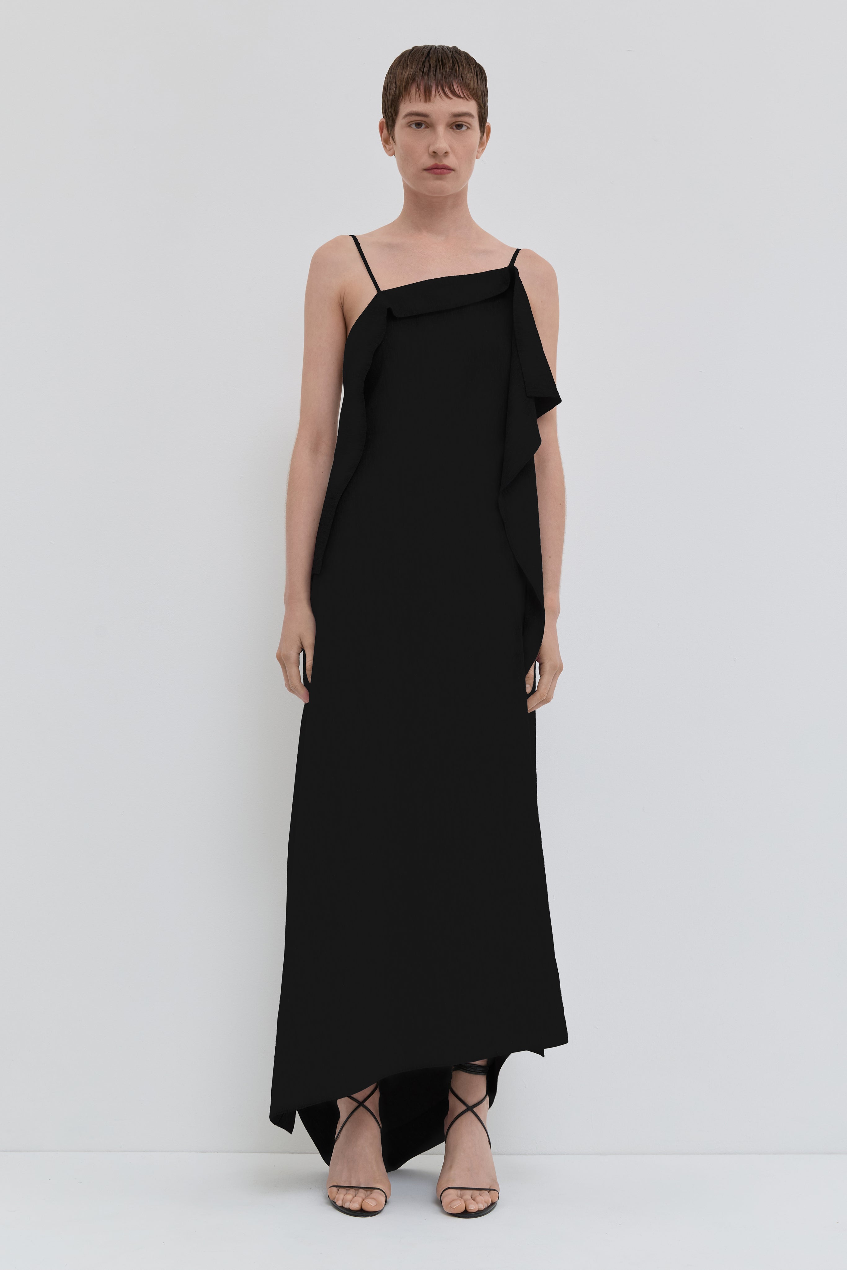 The Domo Strap Dress in black is a refined draped maxi dress with delicate spaghetti straps and a fluid, elongated silhouette. Crafted from a soft modal blend, known as a more refined and durable member of the viscose family, the fabric feels exceptionally smooth and lightweight while draping effortlessly along the body. The sculptural draping along the neckline and side creates a modern, architectural line, while the asymmetrical hem adds subtle movement and quiet drama. A timeless black maxi dress with a sleek, sensual feel that transitions seamlessly from understated daytime elegance to elevated evening wear.