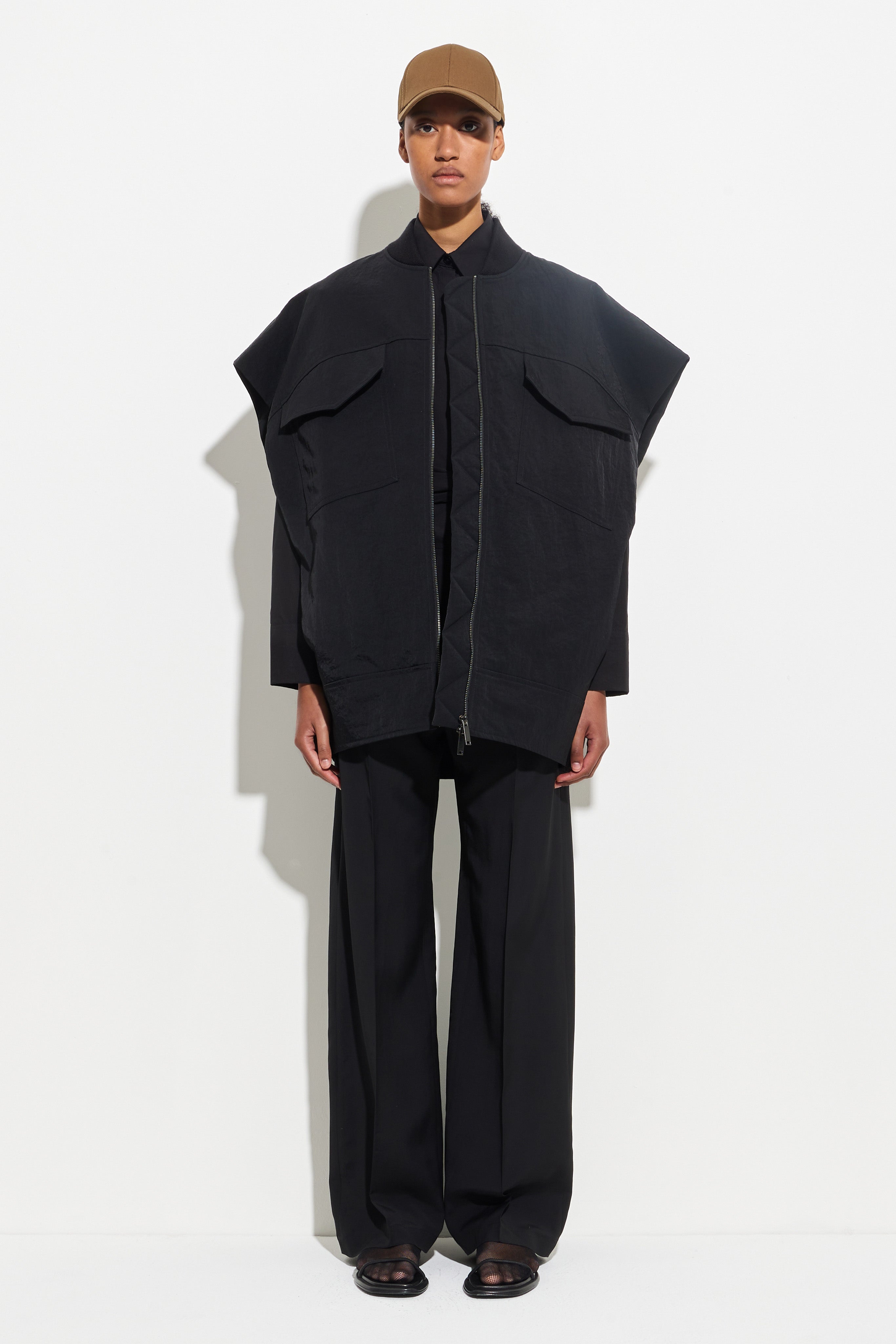 ボリュームのあるノースリーブのボンバージャケット。肩を大胆にあしらい、彫刻的なシルエットに仕上げました。ワイドなボディに、ダブルジップフロントと2つのオーバーサイズのフラップポケットがバランスよく施されています。襟元はリブ。裾はややラウンドカット。