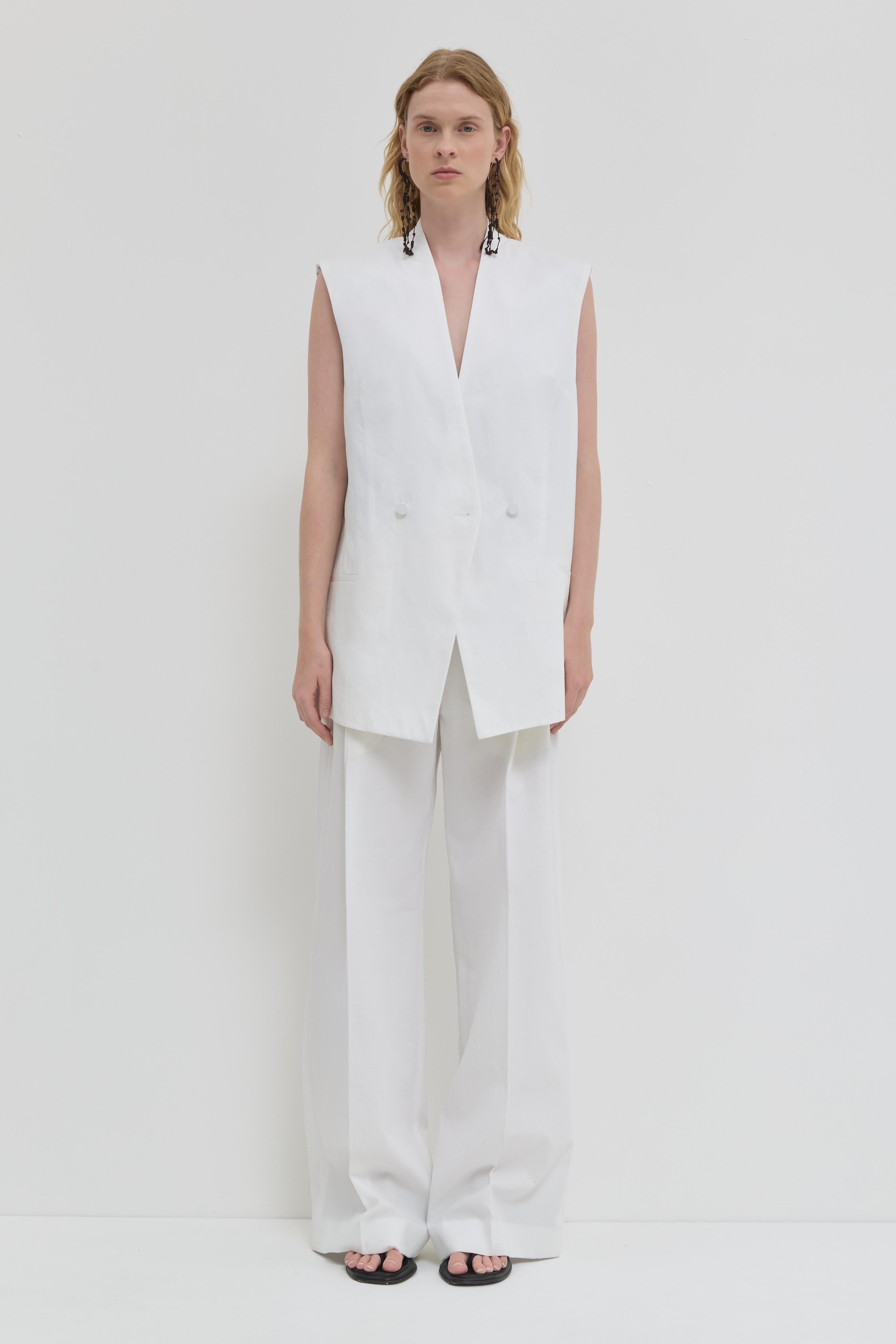 The Judrio Sleeveless Blazer in white is a clean and modern tailoring piece with a sharp, minimal silhouette. Crafted from 100% cotton, it offers structure while remaining breathable and comfortable to wear. Designed with covered buttons and a strong sleeveless cut, this white sleeveless blazer creates a refined yet effortless look. Style it over a long sleeve top or wear it on its own for a confident, contemporary outfit. A timeless cotton blazer that works beautifully with both tailored trousers and relaxed pieces.