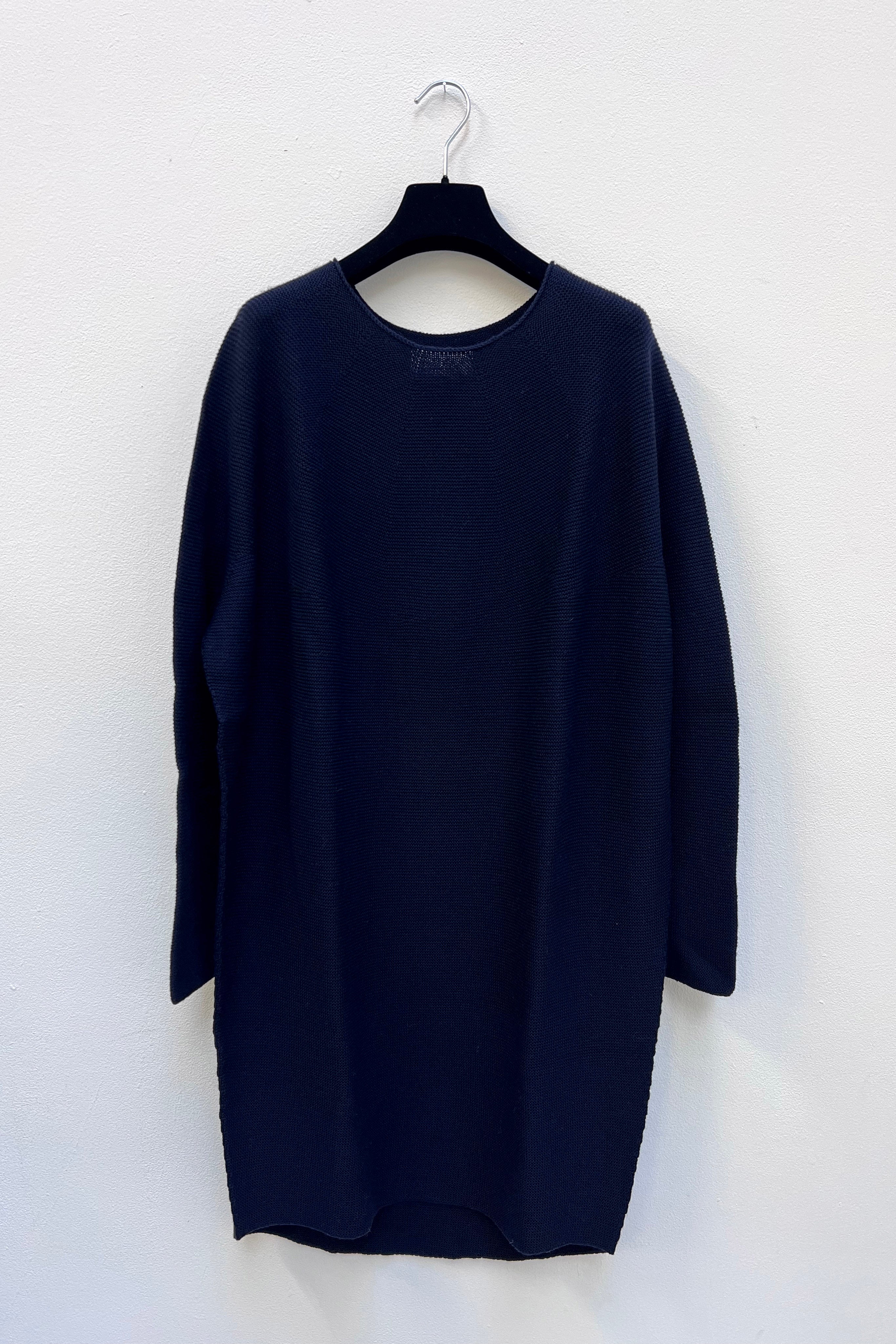 Whole garment knit round neck sweater dress in extra fine merino with long dolman sleeves and rounded hemline.