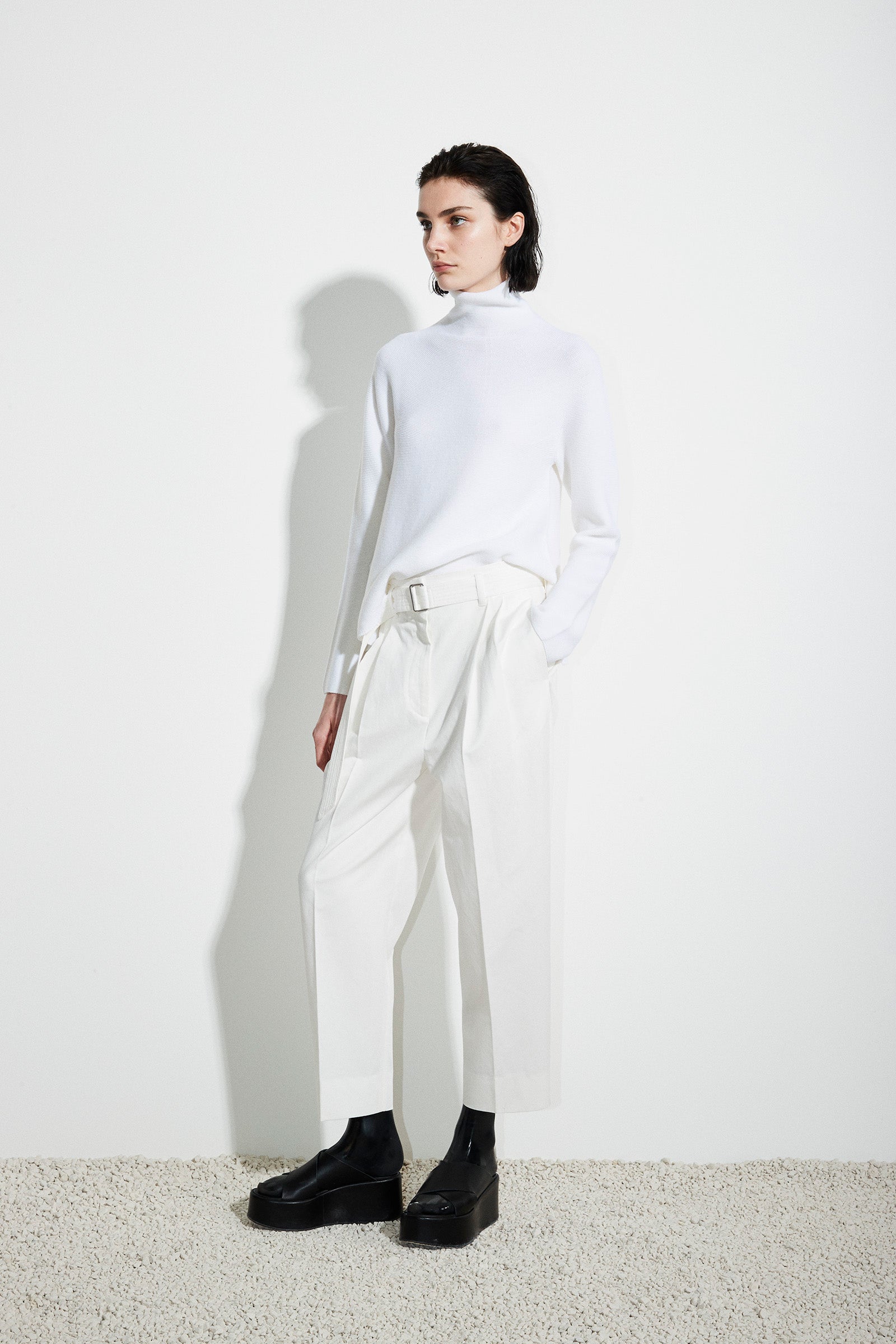 Whole garment knit sweater with turtleneck, long sleeves and side slits in extra fine merino wool.