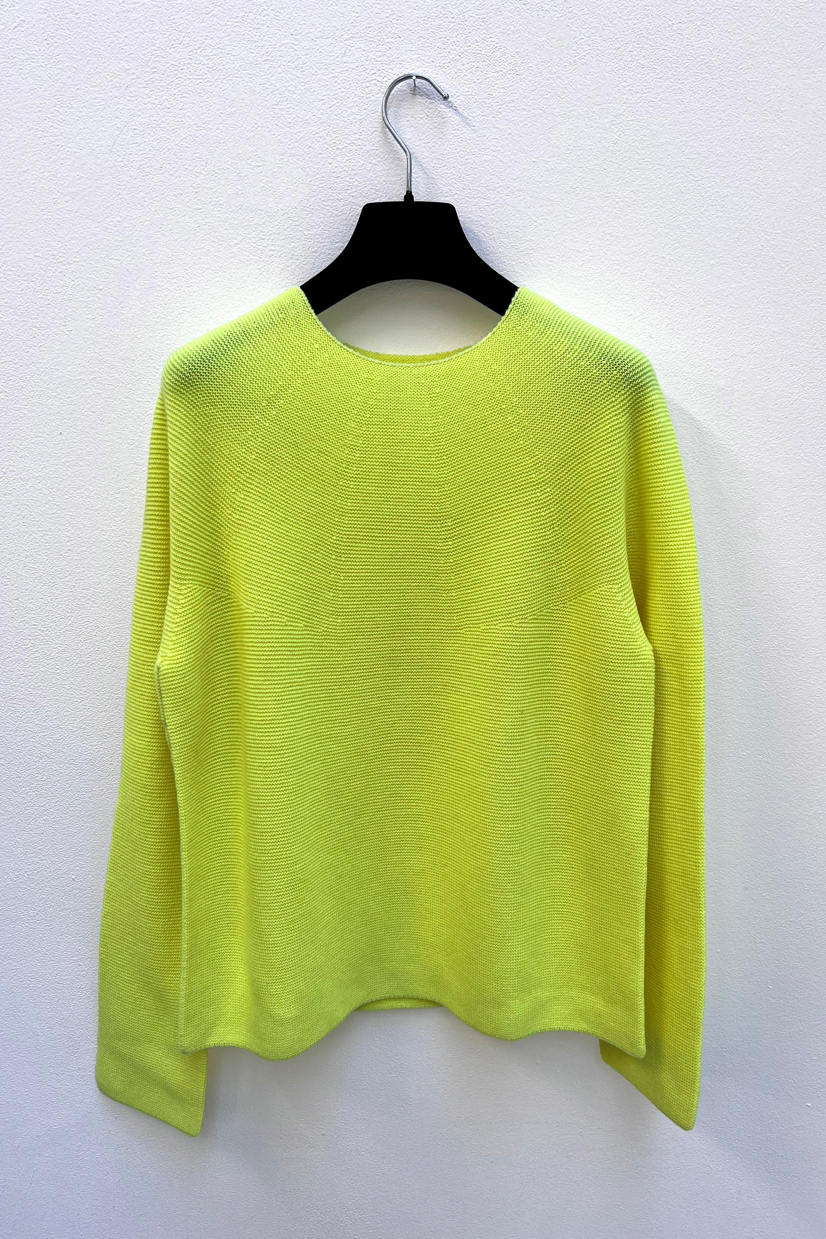 Whole garment knit purl stitch crewneck sweater with long sleeves and straight hemline in extra fine merino wool.