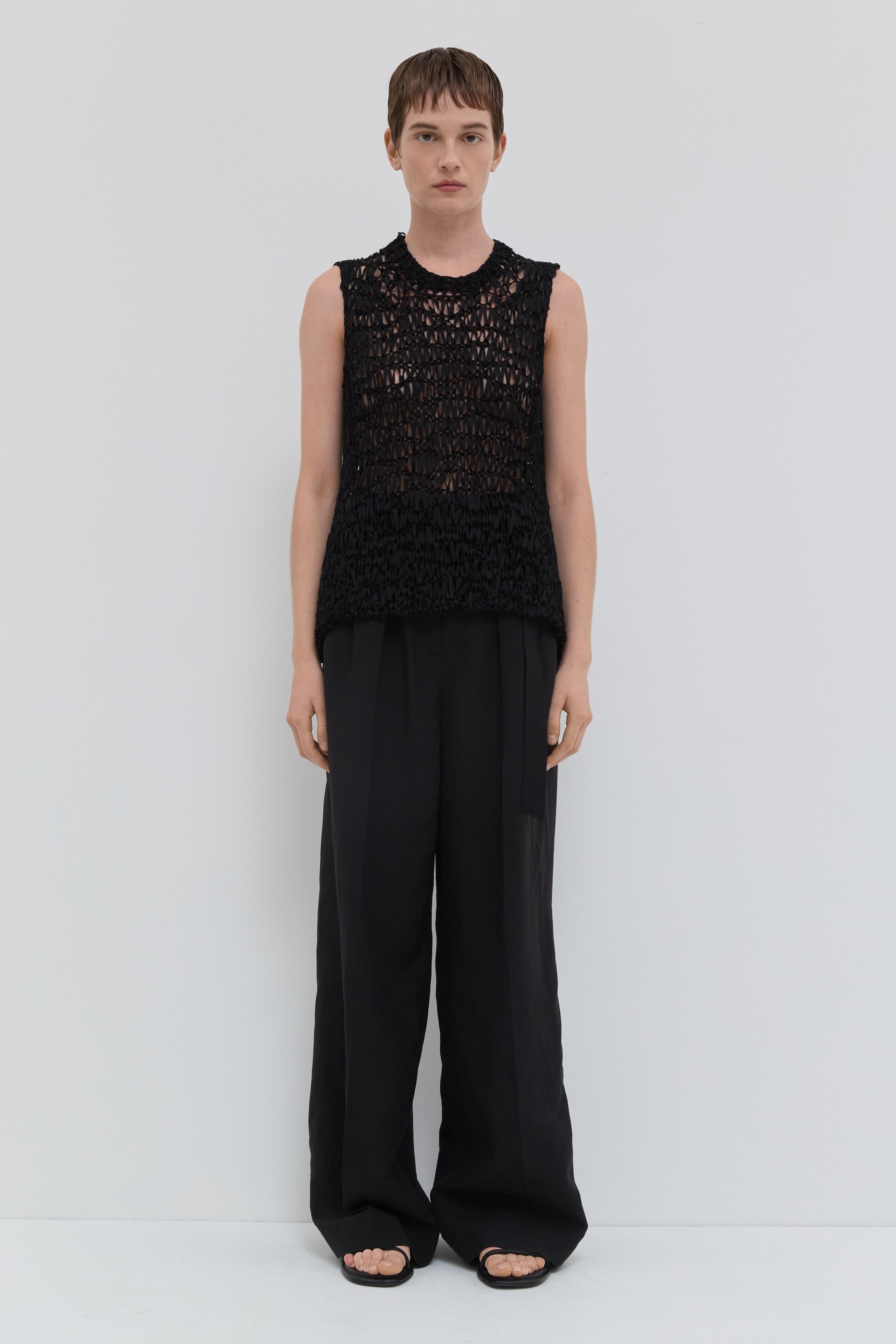 The Kouadio Hand-Knitted Top is crafted from 100% viscose and designed as a refined knitwear piece with artisanal character. Hand-knitted with an open textured structure, it feels light and breathable on the skin. The detailed knit pattern adds depth and subtle dimension to the sleeveless silhouette, creating a modern piece with a natural, elegant finish.
