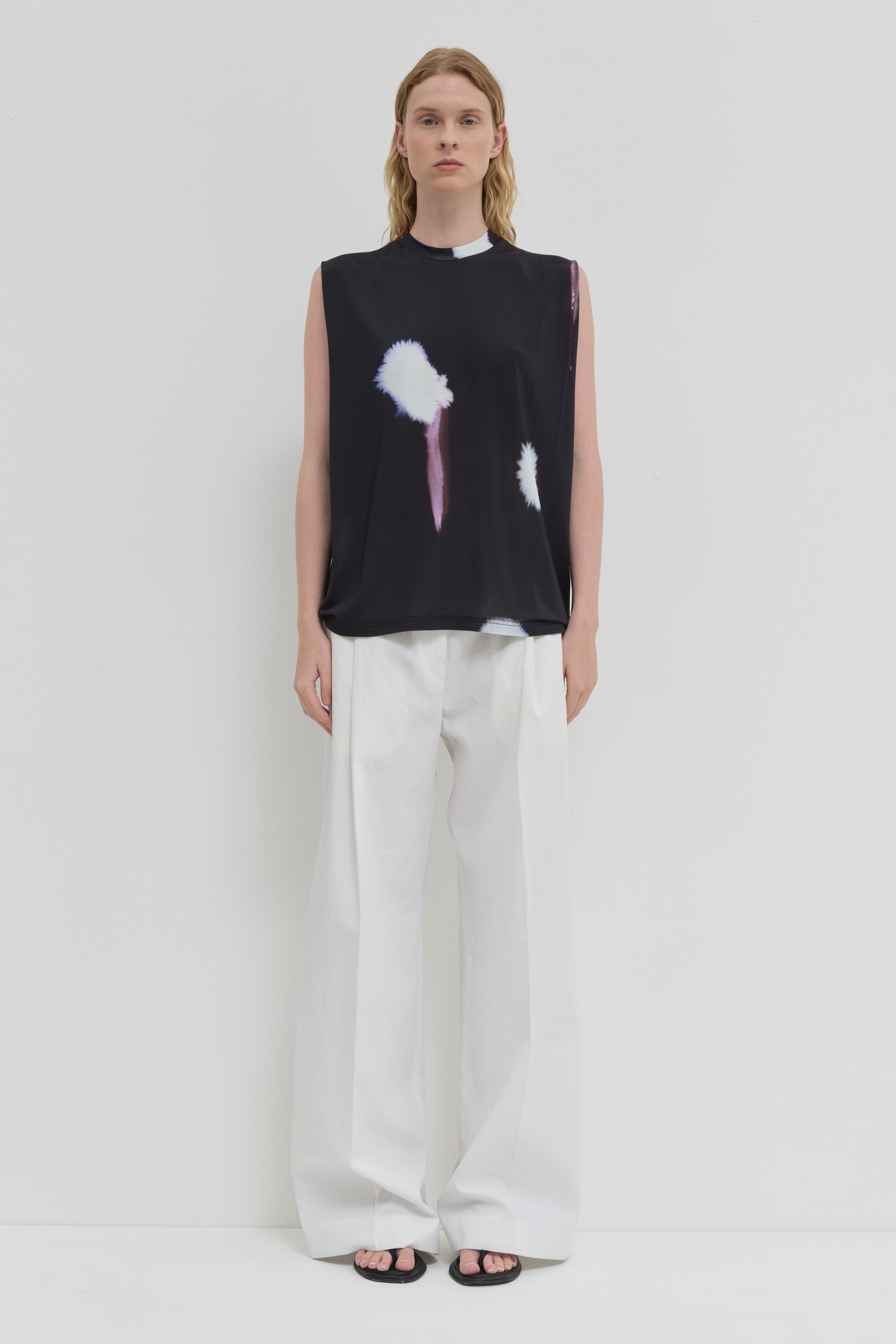 The Tabansir Sleeveless Top in Midnight Alliums is crafted from FSC-certified viscose and printed in Italy. Designed with a subtle pleated shoulder detail, it adds soft structure to its clean, sleeveless silhouette. The breathable viscose fabric offers a smooth, fluid drape, enhancing comfort throughout the day. The midnight alliums print brings a refined, artistic touch, giving this modern top a distinctive yet elegant character.