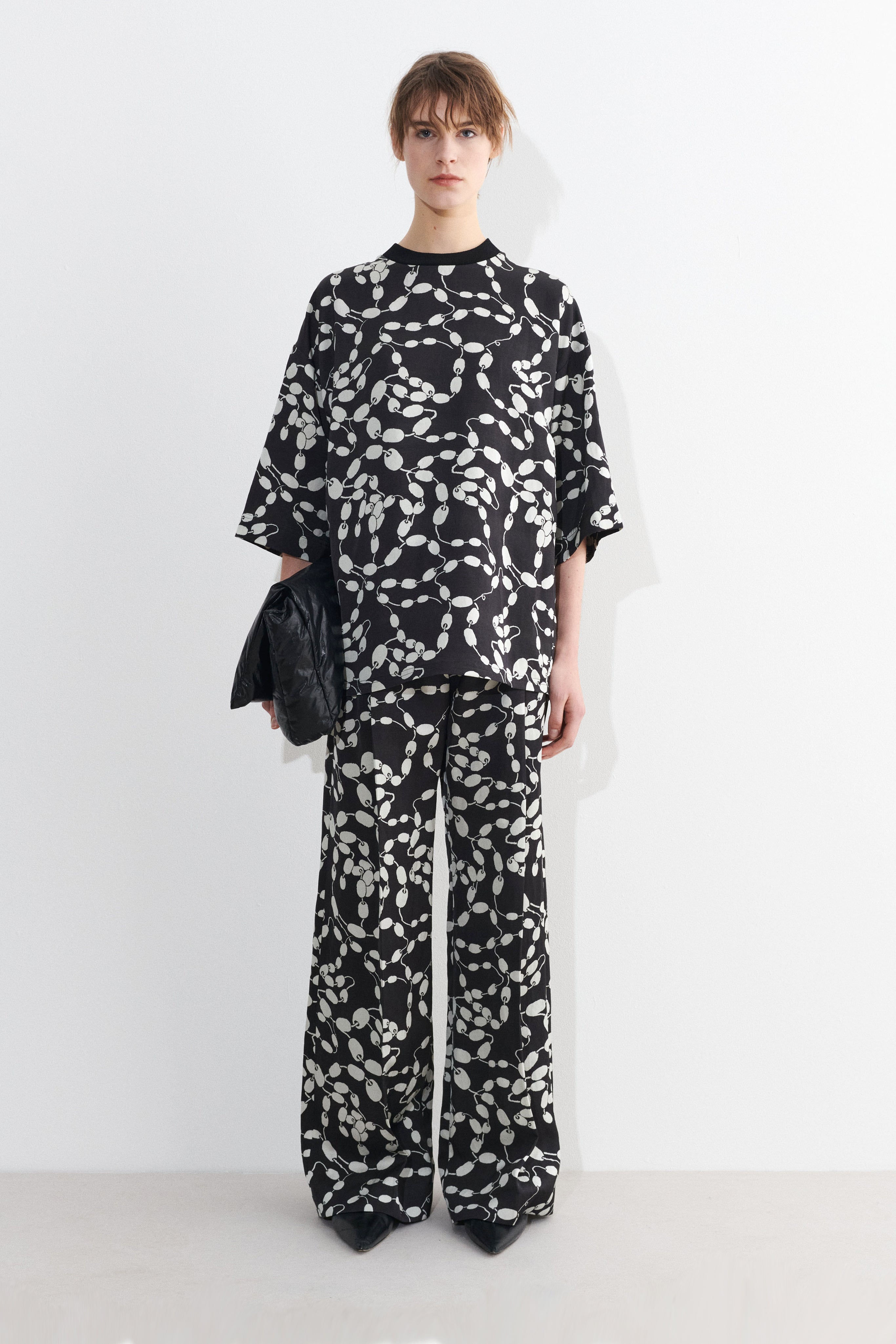 Boxy shirt in black and white viscose with ribbed collar and buoy print.