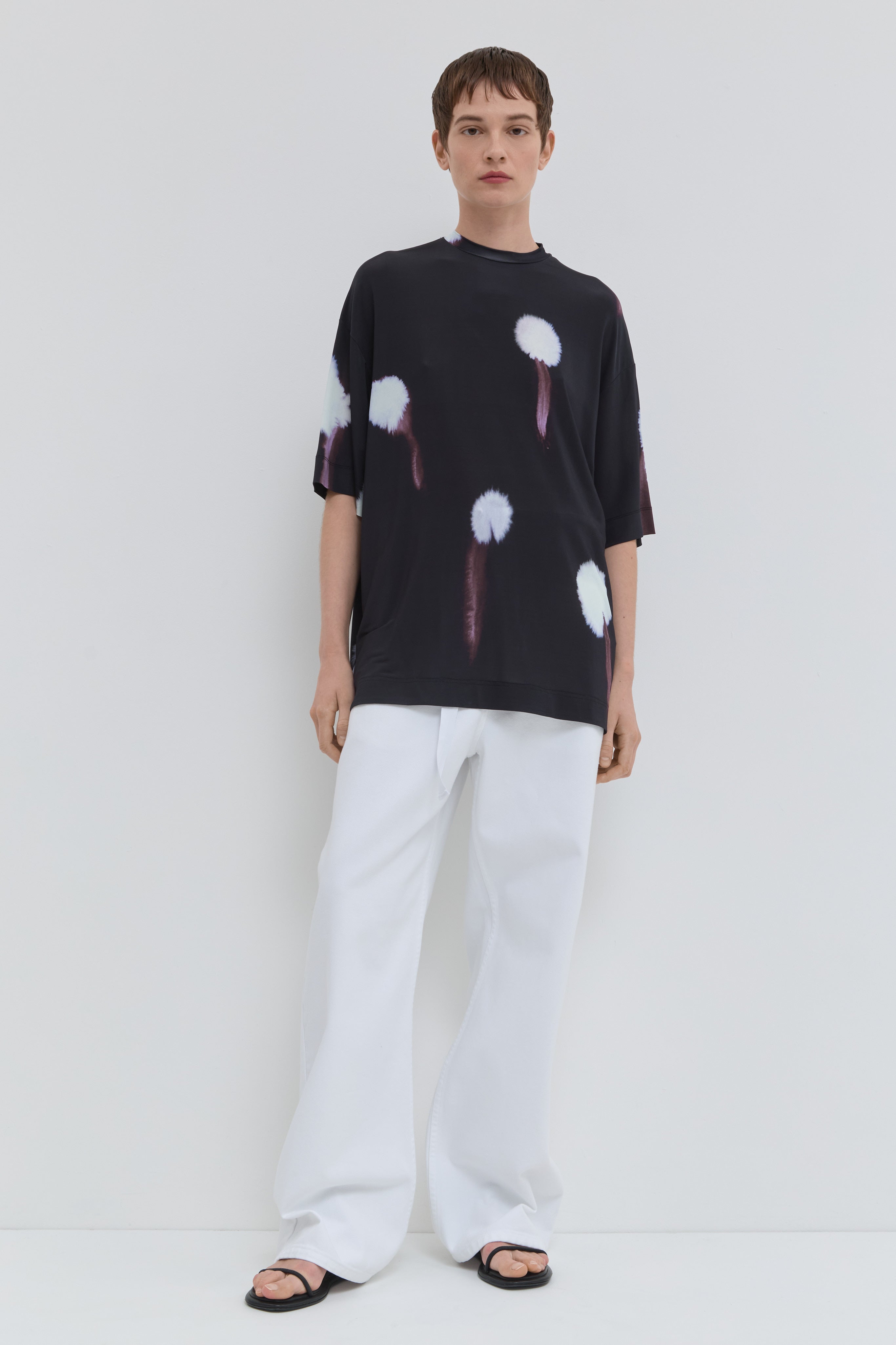 The Tiswa Jersey Top is an oversized viscose jersey T-shirt crafted from FSC-certified viscose and printed in Italy. Designed in the Midnight Alliums print, this women’s oversized jersey top features a fluid drape, short sleeves, and a relaxed silhouette for elevated everyday comfort. The soft, breathable viscose fabric enhances the bold floral print, making this printed viscose T-shirt a modern statement piece for refined styling.