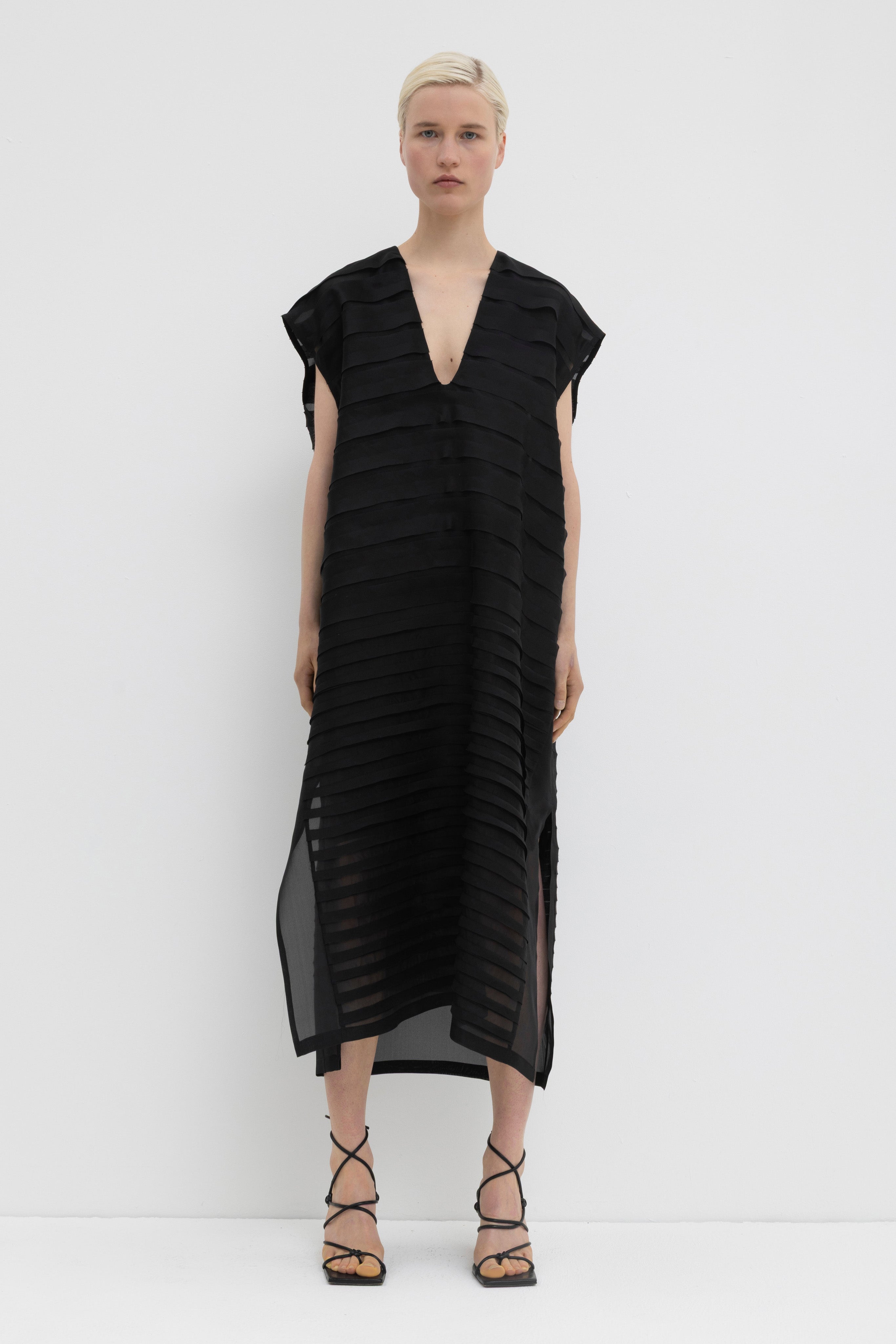 The Deralo Woven Dress in silk features a bold geometric form shaped through handmade cutting. No two pieces are alike, each bearing the distinctive mark of artisanal construction. Style as a standalone statement or layer with other pieces for added dimension. Deliberate craftsmanship defines every detail.