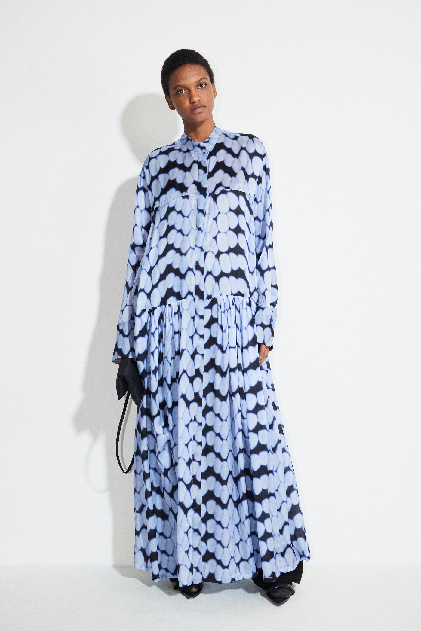 Loose fit long dress with batherings, button down closure, stand-up collar, long sleeves in printed silk charmeuse.