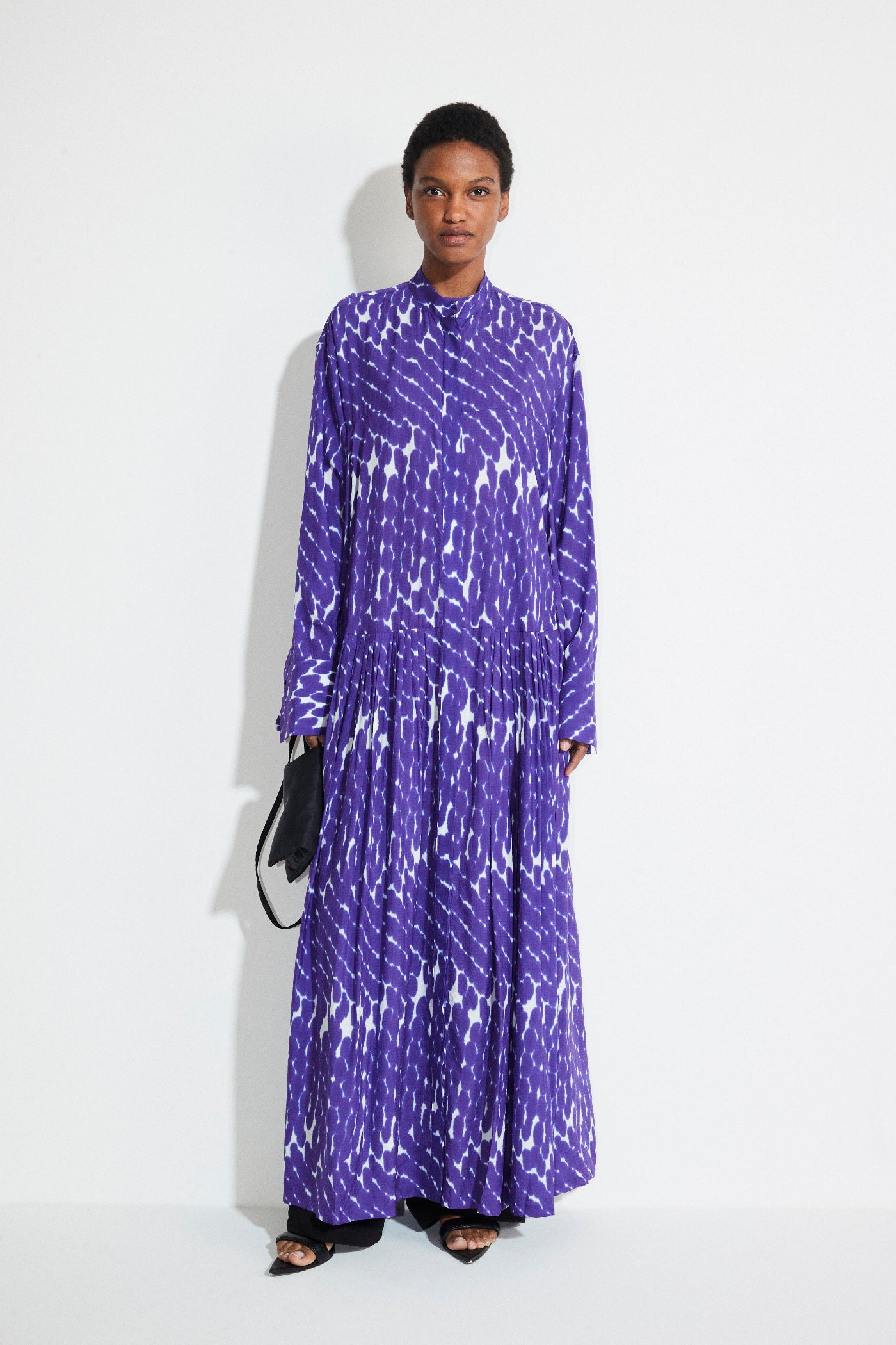 Loose fit long dress with batherings, button down closure, stand-up collar, long sleeves in printed parachute silk/rayon blend.
