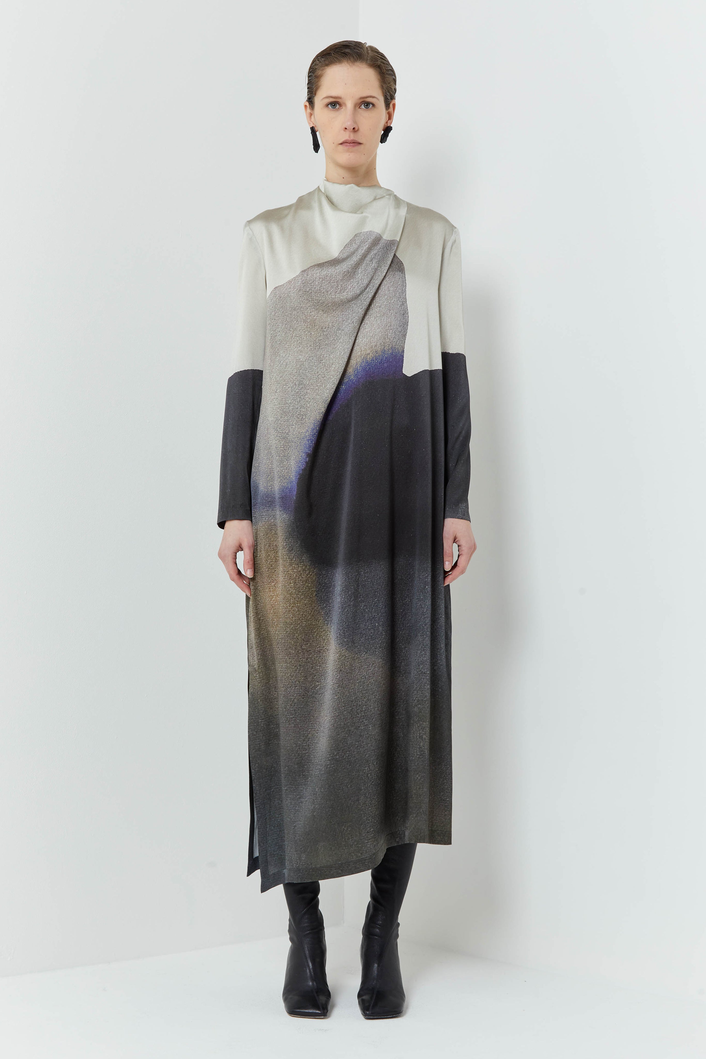 Mid length dress with slim sleeve & drapy collar.