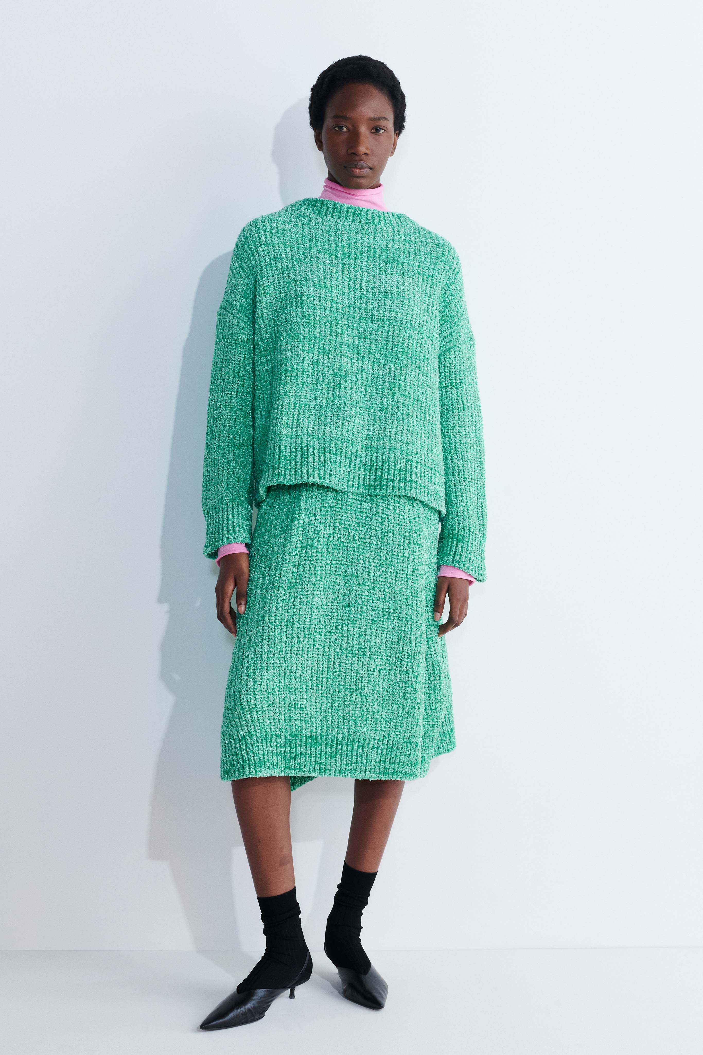 Under-knee length, a-line shape rib skirt with side pockets, elastic waistband, and slits at the front.