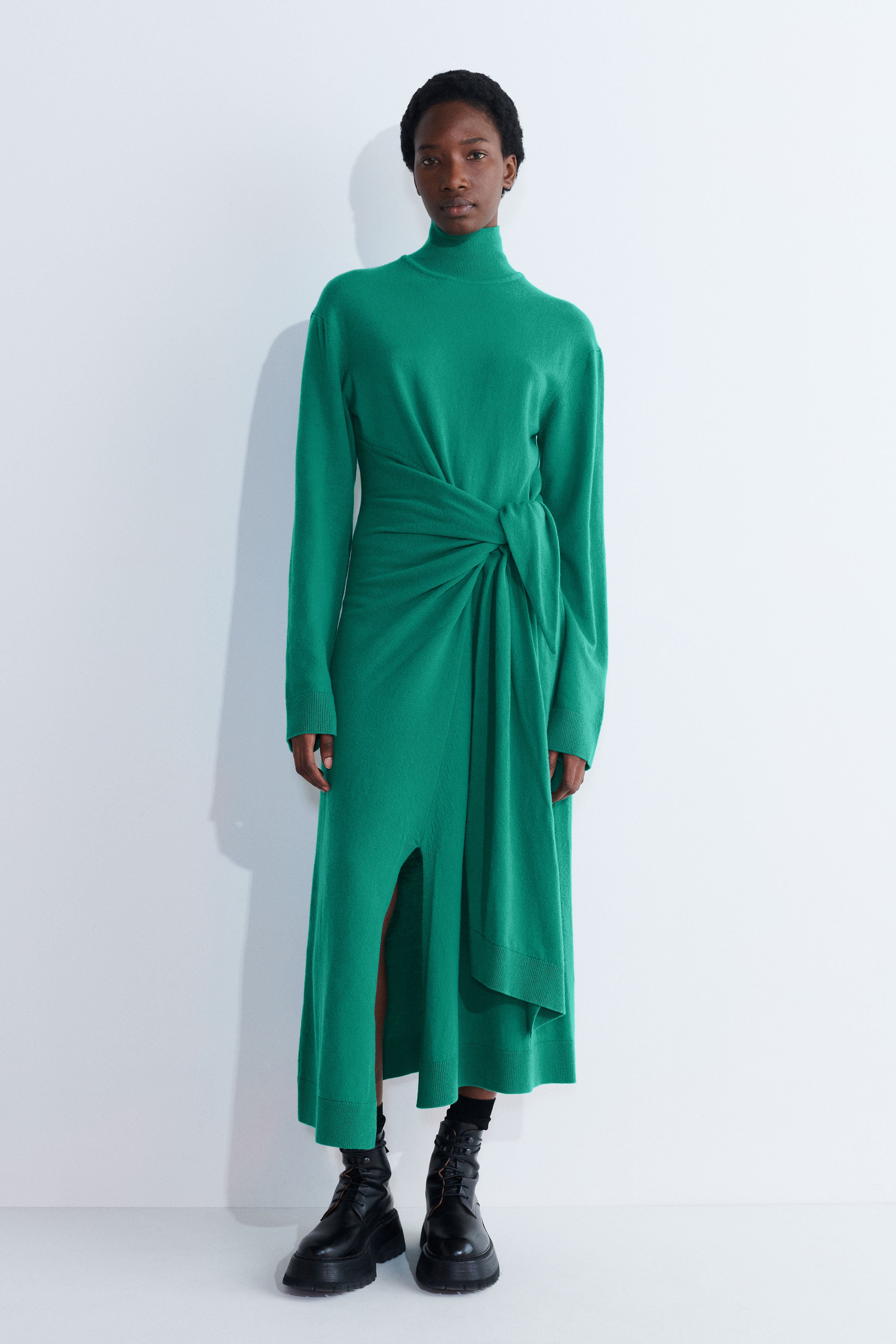 Mid-length long-sleeve wrap-around super fine wool dress with high rib neck