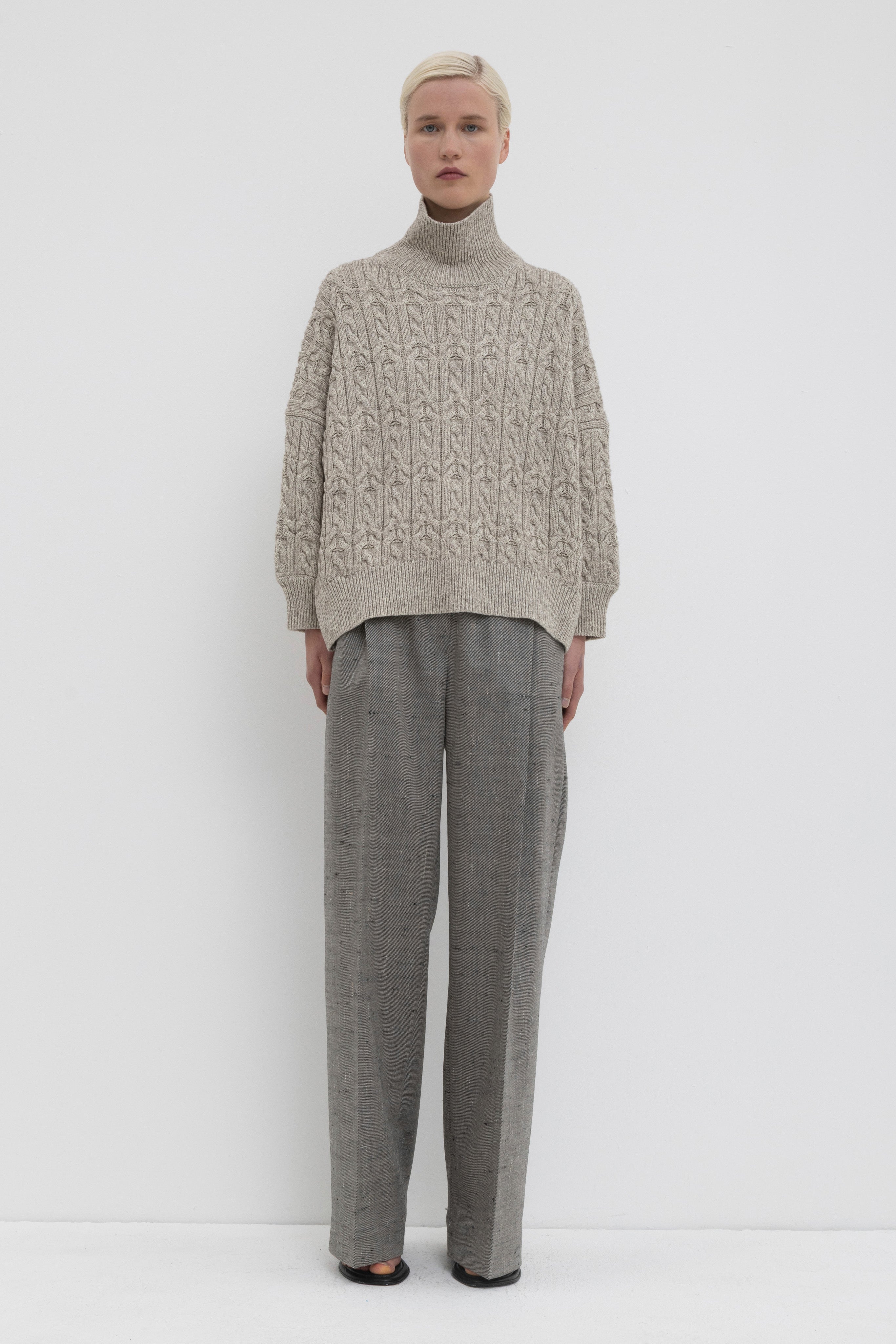 Kwisis Knitwear Top in Italian yarn. This short-sleeve sweater combines a striking cable stitch with a high neckline for understated luxury. Responsibly sourced materials meet expert craftsmanship in a piece designed for effortless elegance.