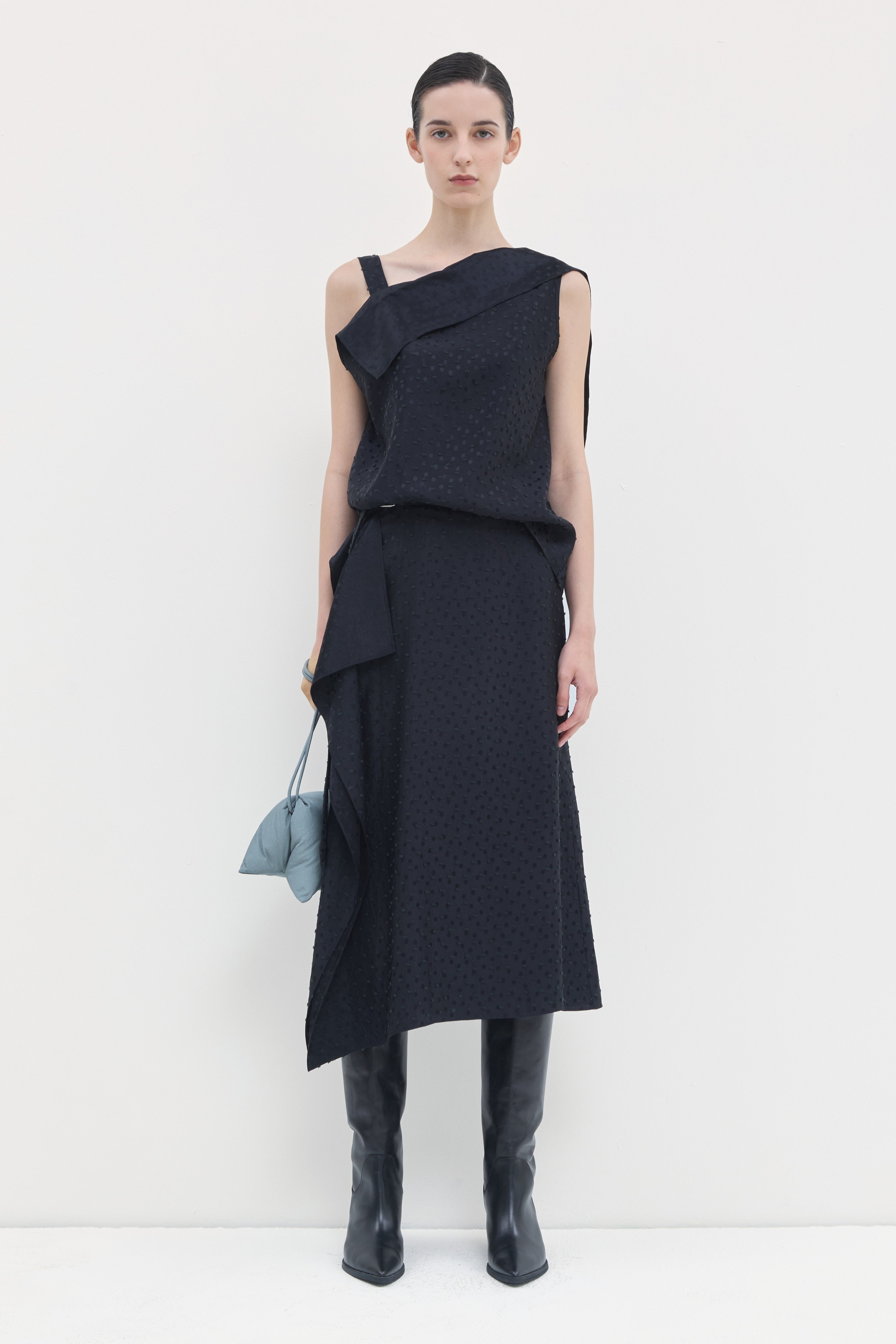 Scala Woven Skirt with an elegant asymmetric cut and belt closure in black petrol dot. Pair with the dotted Turini top for a coordinated ensemble, or wear alone for versatile styling. The distinctive silhouette and refined proportions make this a wardrobe essential.