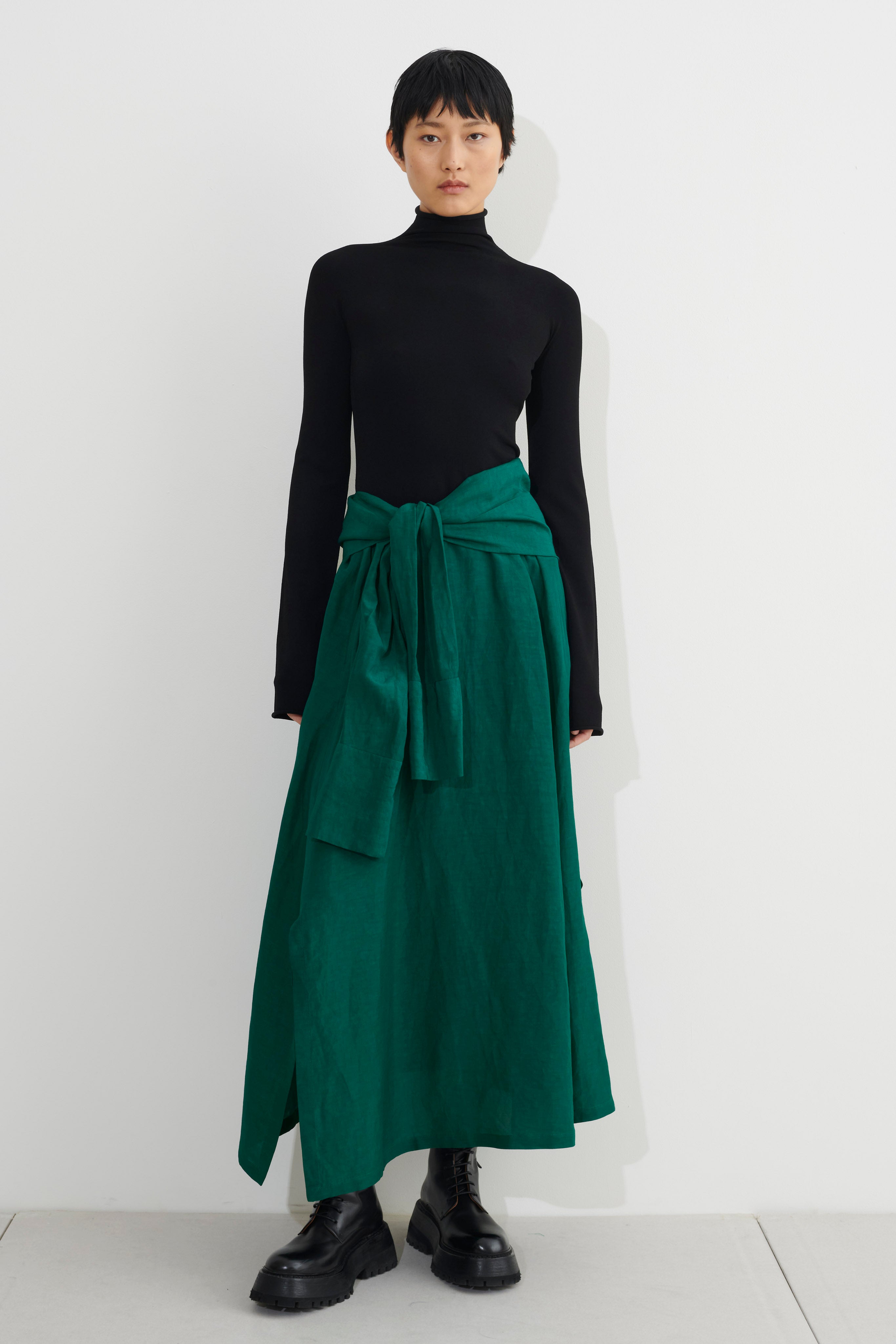 Mid length drapy skirt with knot detail around the hip, side pockets and side slits in solid viscose linen blend.