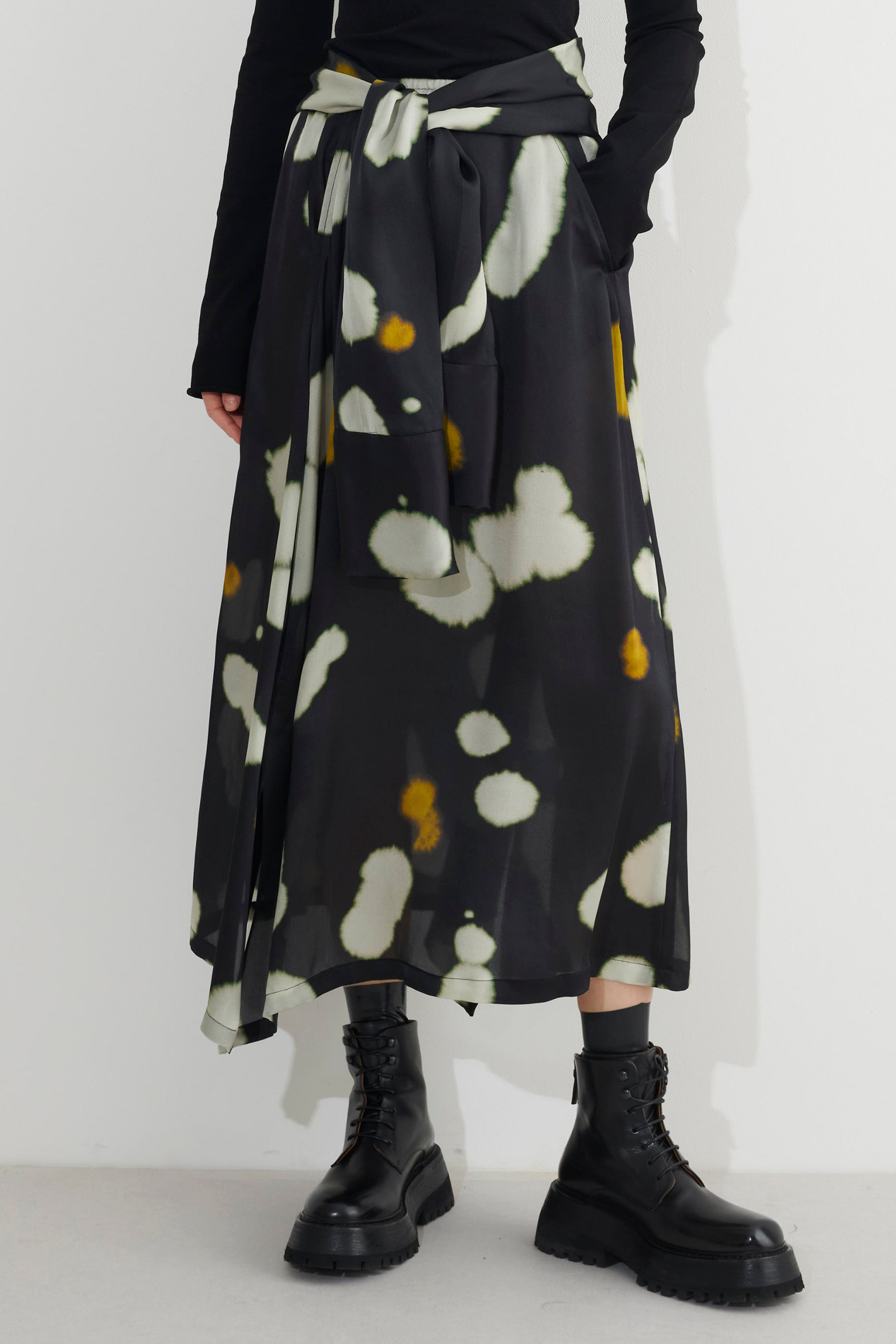 Mid length drapy skirt with knot detail around the hip, side pockets and side slits in printed silk charmeuse.