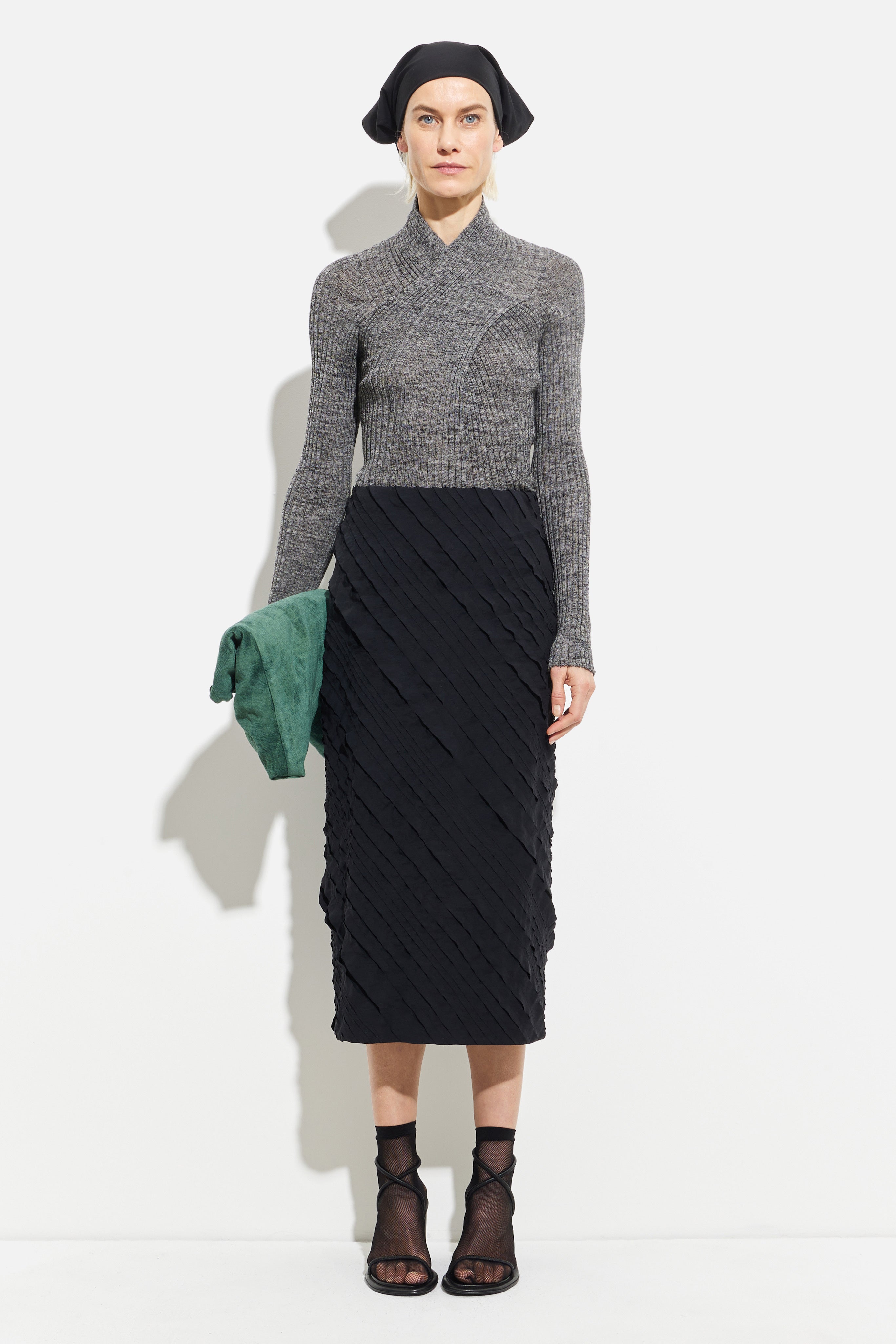 An expressive pencil skirt distinguished by a hand-made bias-slice finish. Each diagonal incision is hand-cut and subtly frayed, giving the surface a tactile, almost sculptural rhythm. The silhouette is neat and elongating, with a concealed zip and a clean waistband. Designed to sit high on the waist and fall below the knee.