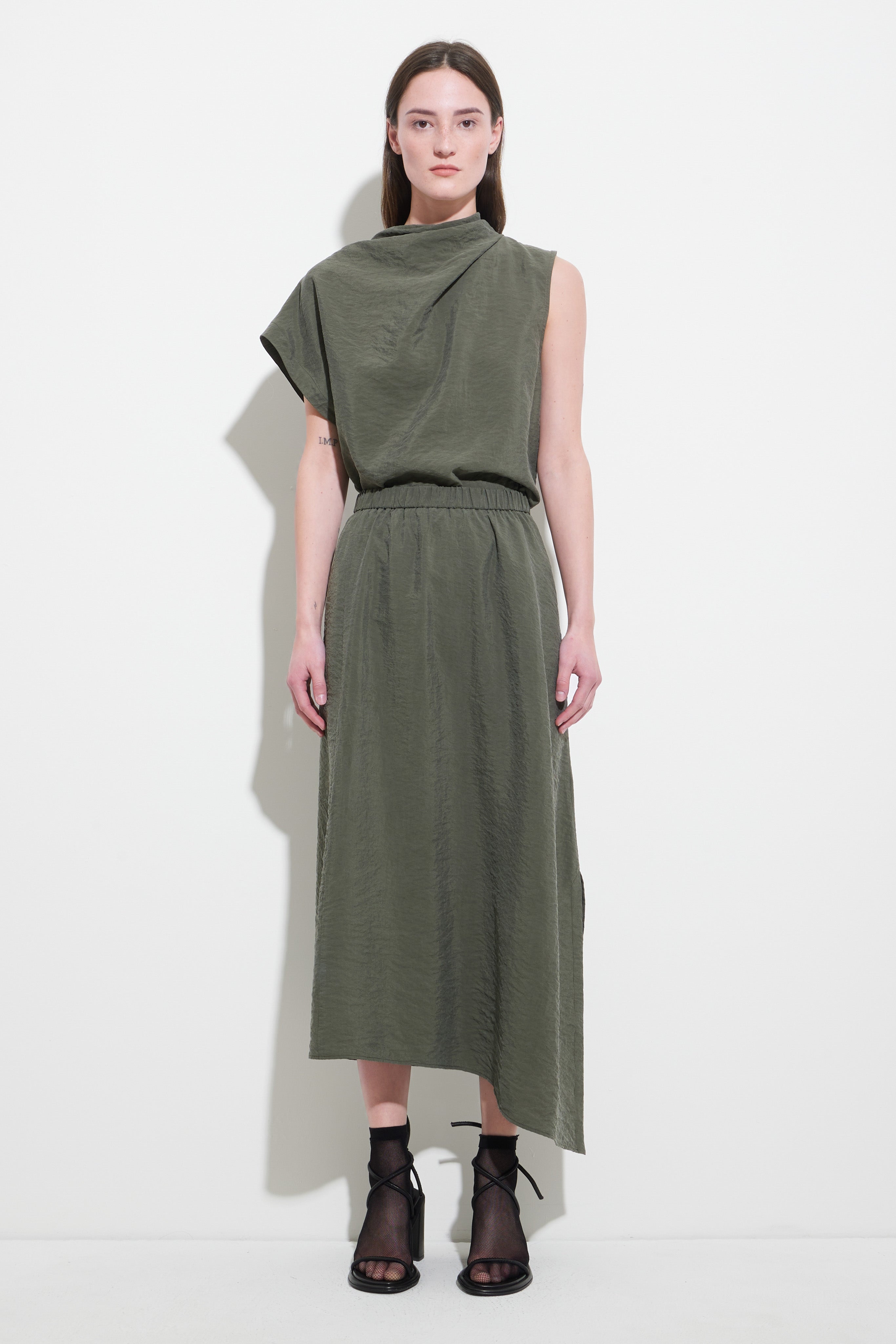 A softly structured midi skirt in a washed thyme green, crafted from lightweight, crinkled fabric that drapes with a natural, subtle sheen. Features an elasticated waistband for comfort, relaxed volume through the body, and a modern asymmetric hem. The understated texture and clean lines make this skirt a versatile piece for elevated everyday wear.