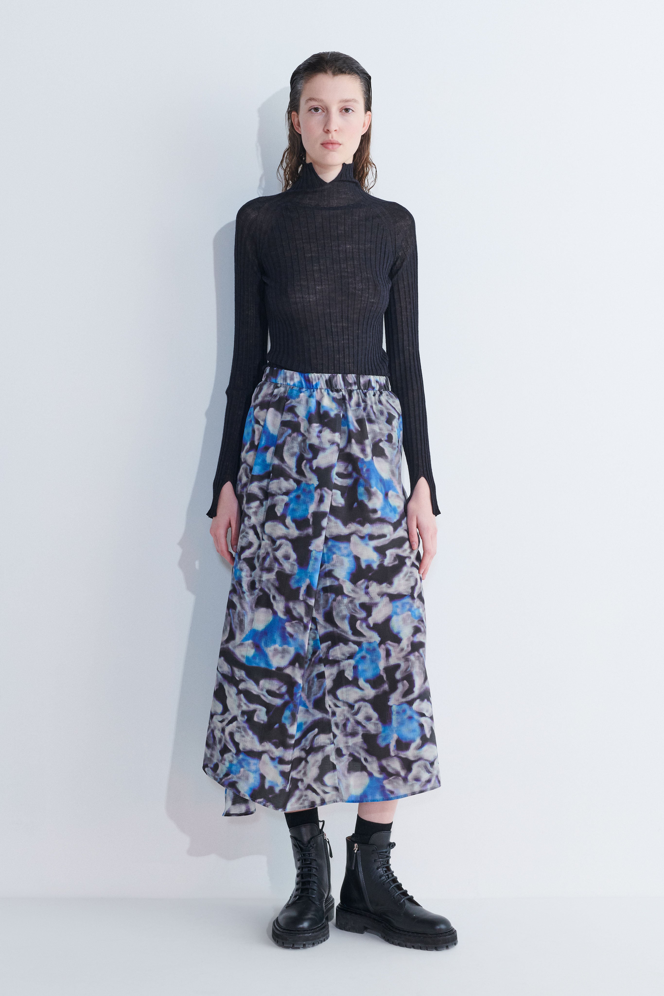 Mid-length fluid elastic waistband skirt in printed parachute silk.