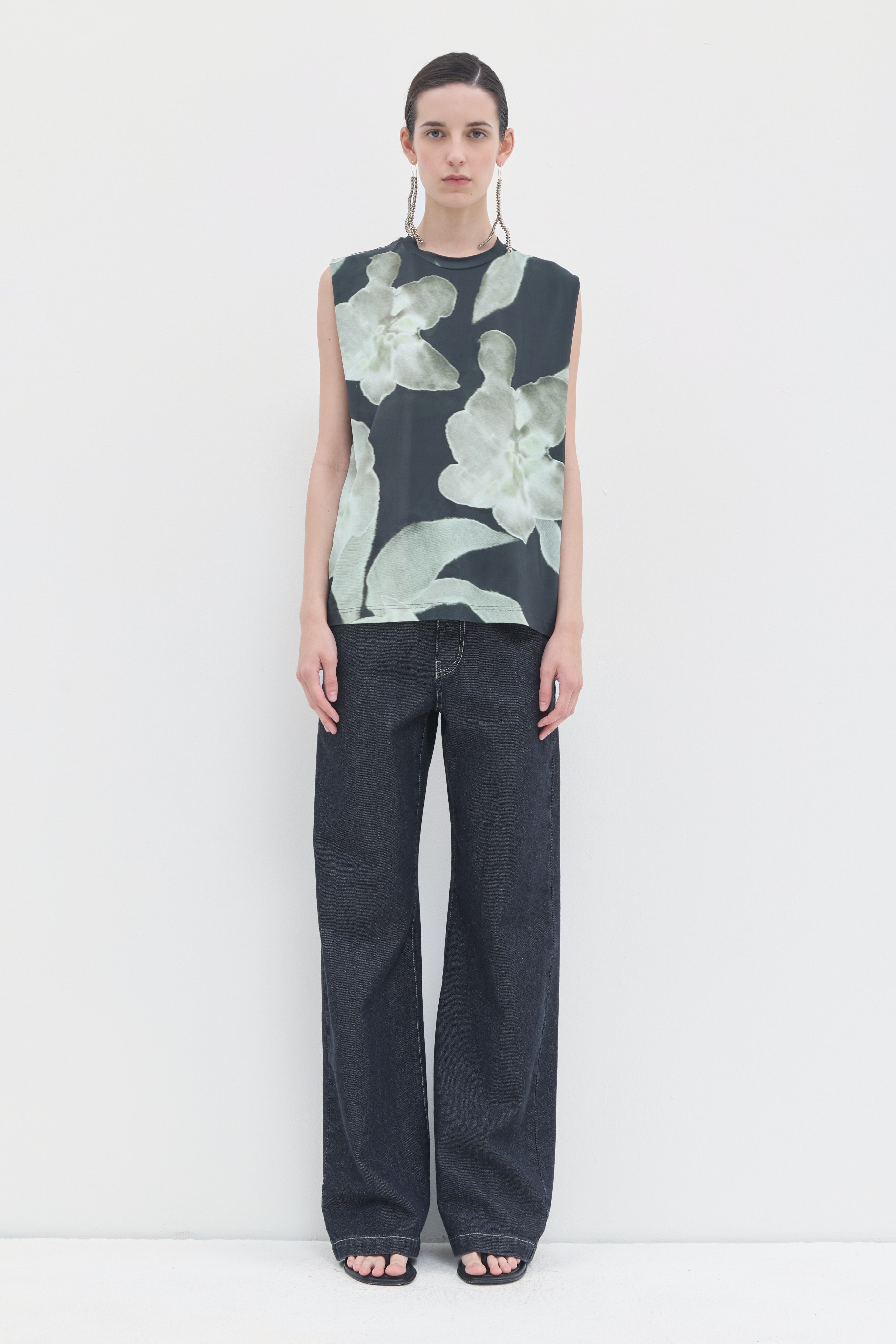 Sleeveless jersey top with a distinctive pleat detail at the shoulder that adds visual interest and shape. The printed design brings character to the piece, while the clean lines and thoughtful construction make it an easy choice for layering or wearing on its own.