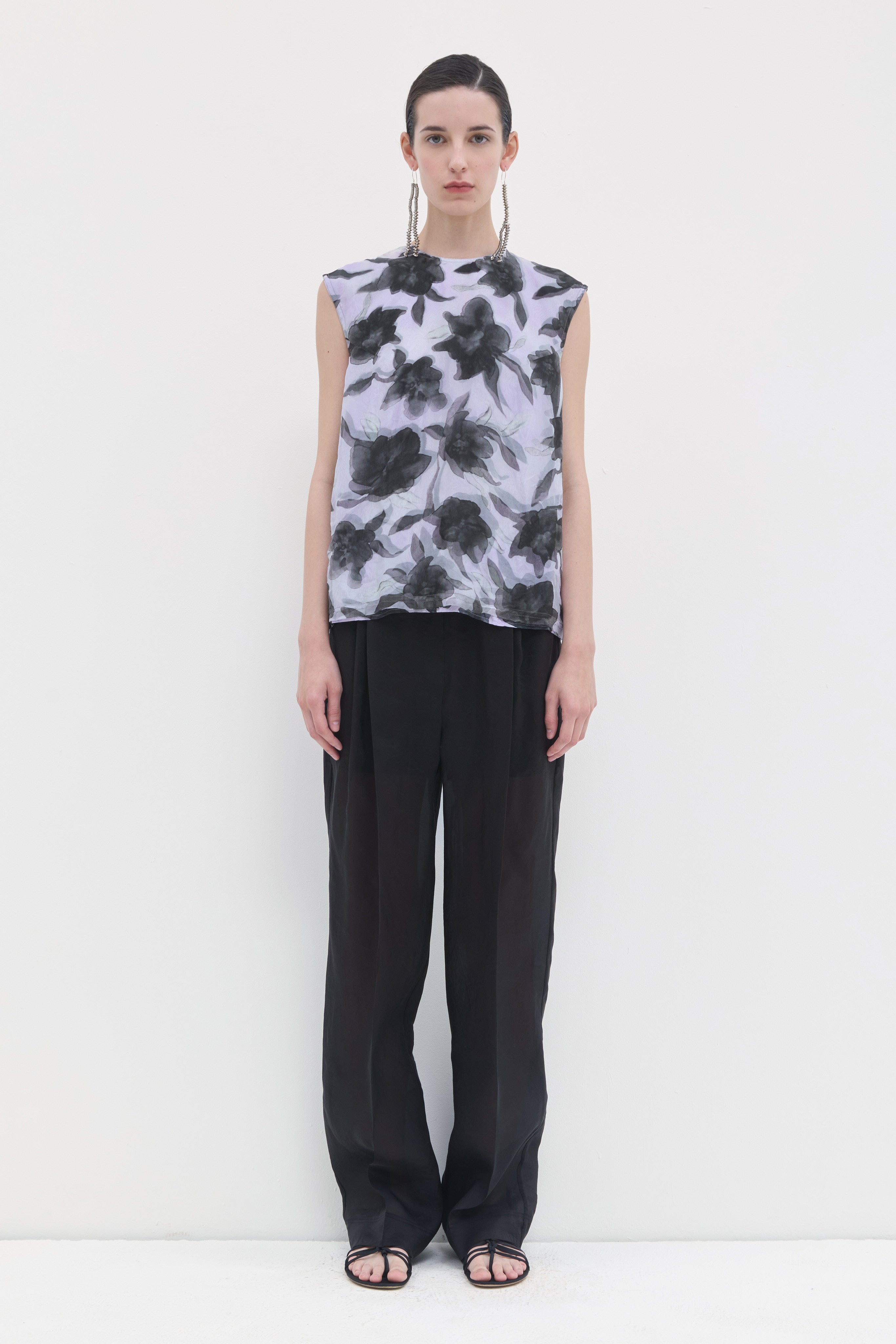 Sophisticated sleeveless top featuring a double-layered silk construction in an understated print. The layered design provides subtle depth and movement, while the refined silhouette offers versatility for both structured and relaxed styling within a contemporary wardrobe.