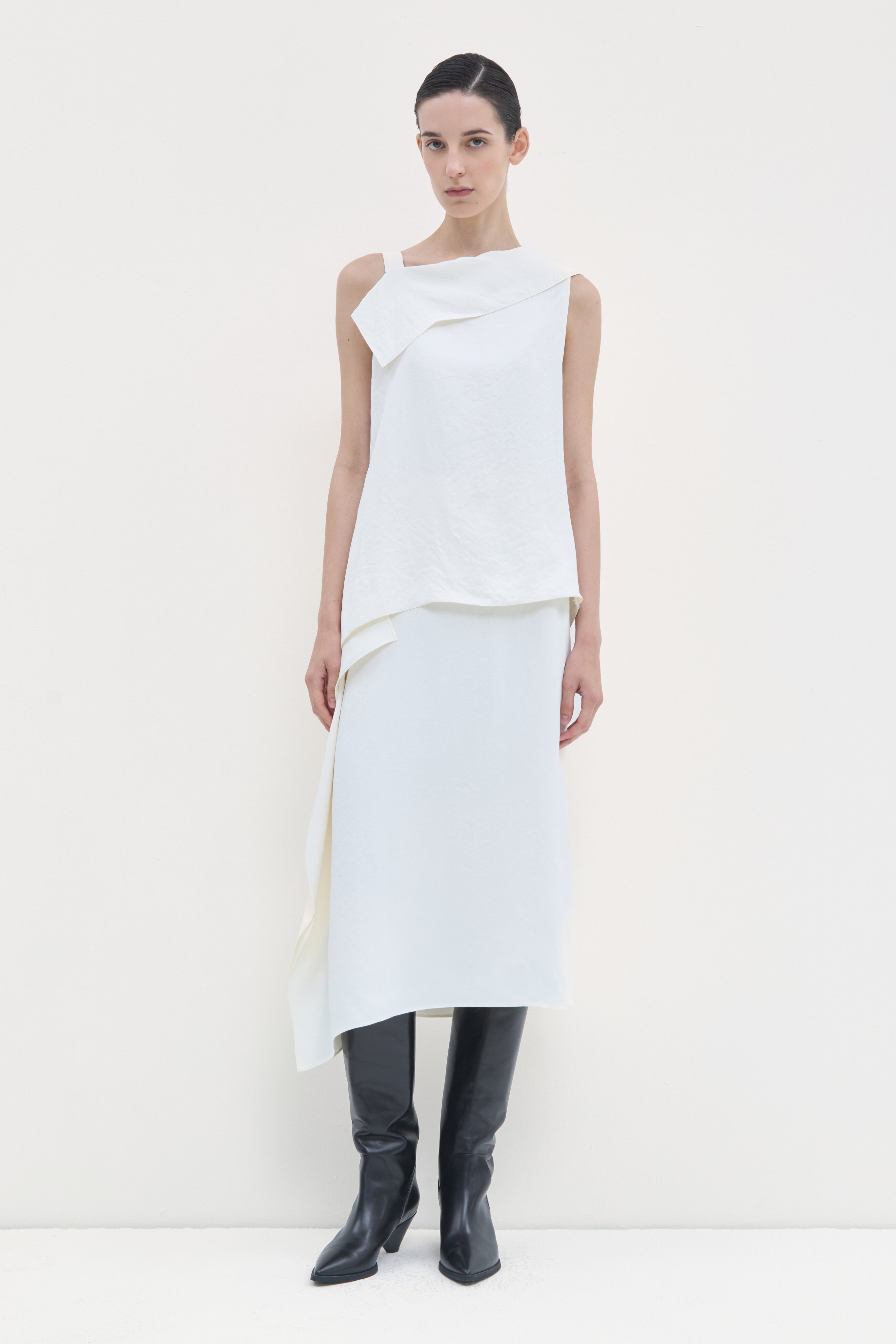Asymmetrical woven top with structured flap and adjustable shoulder strap. Premium construction with architectural seaming and refined proportions. A sophisticated layering essential that balances design innovation with everyday versatility.